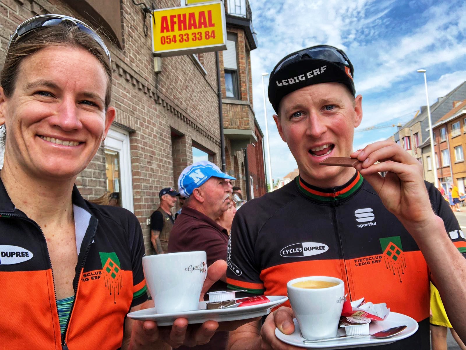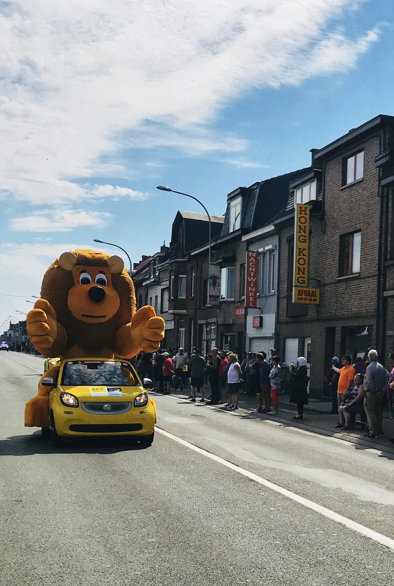 In Ninove vloeit het bier al voor 11en en als we in een drukke kroeg 6 koffie en cola bestellen wordt er gezegd “wacht maar buiten ik onthoud jullie wel en kom het brengen”. Top service! Met een drankje naar de reclame caravaan kijken. Wafels eten en weer rap terug naar parcours: Tour kijken!