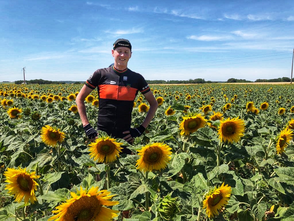 We komen in Vendône, waar de prachtige 13e eeuwse Abbaye de la Trinité staat. Hier eten we een tosti en vullen we drinken aan want het begint warm te worden. Waar ik op hoopte gebeurt in het laatste stuk: zonnebloemvelden!! Helaas maar enkele maar de hoop dat graan plaats maakt voor bloemen is er.