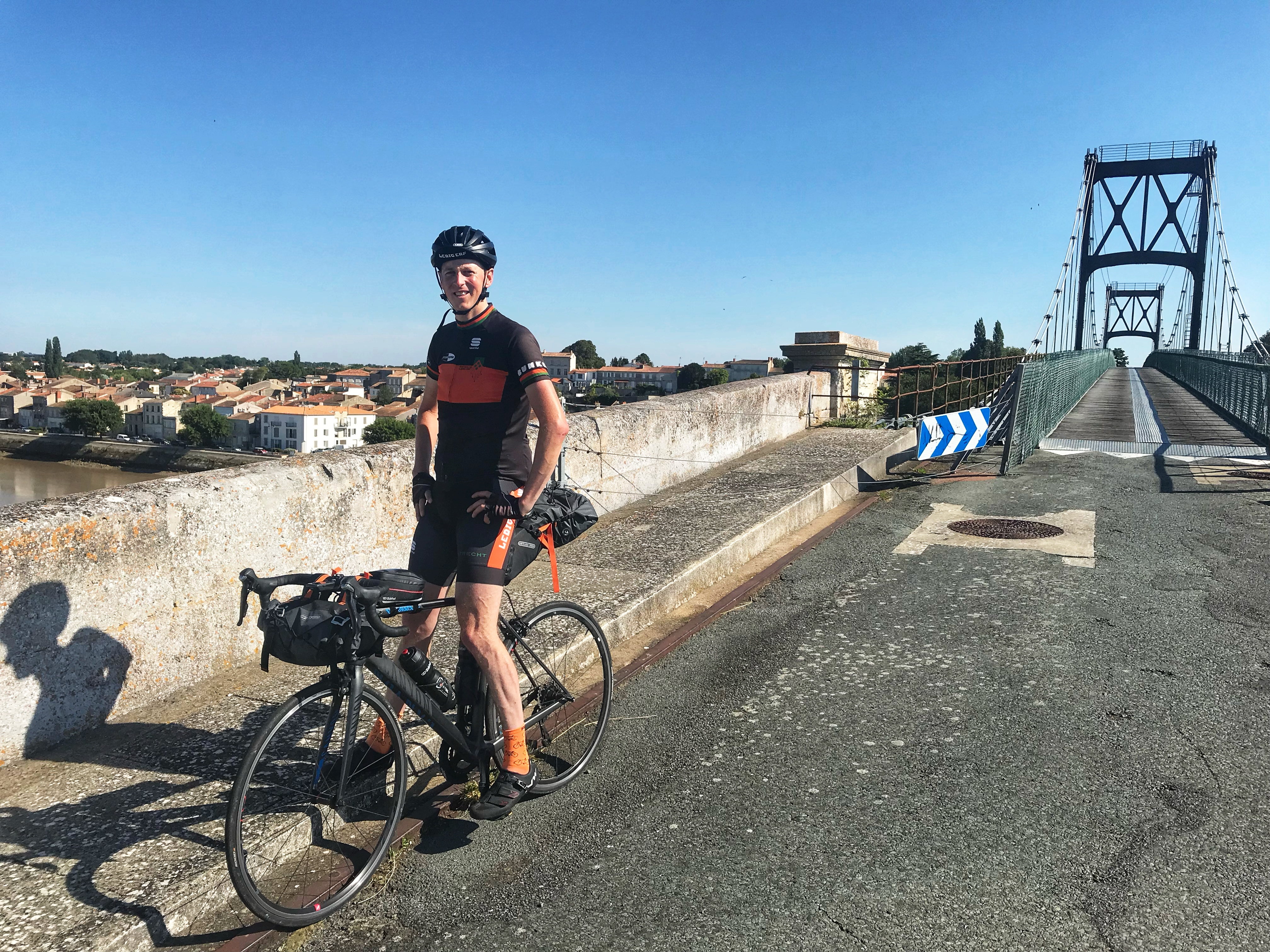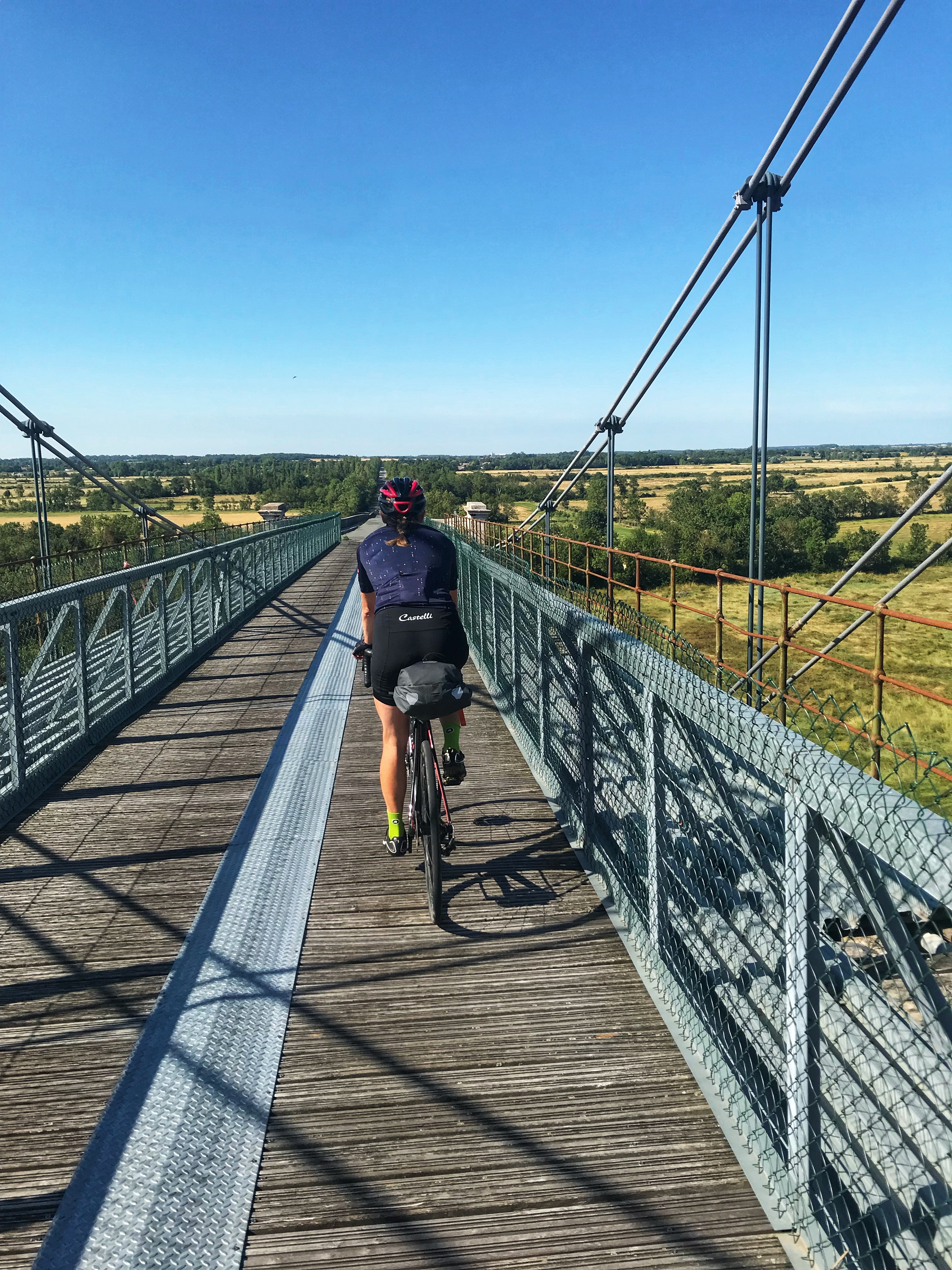 We vertrekken, op naar de kust. Het wordt vlakker en een klein stukje lijkt wel op de Hollandse polder. Dat duurt maar even. Bij Saint-Hippolyte moeten we een brug over. Mensen wijzen naar ons en zeggen dat we moeten omdraaien maar als er hardlopers komen mogen we toch door. Niet heel handig want aan de overkant aangekomen blijkt er een hek te staan dat op slot is gezet. We besluiten de fietsen er overheen te tillen. Bagage eraf, die aan elkaar overgeven, zelfde met de fiets, bagage er weer op en verder. Hoop gedoe maar we zijn wel een mooie brug met prachtig uitzicht over gegaan.