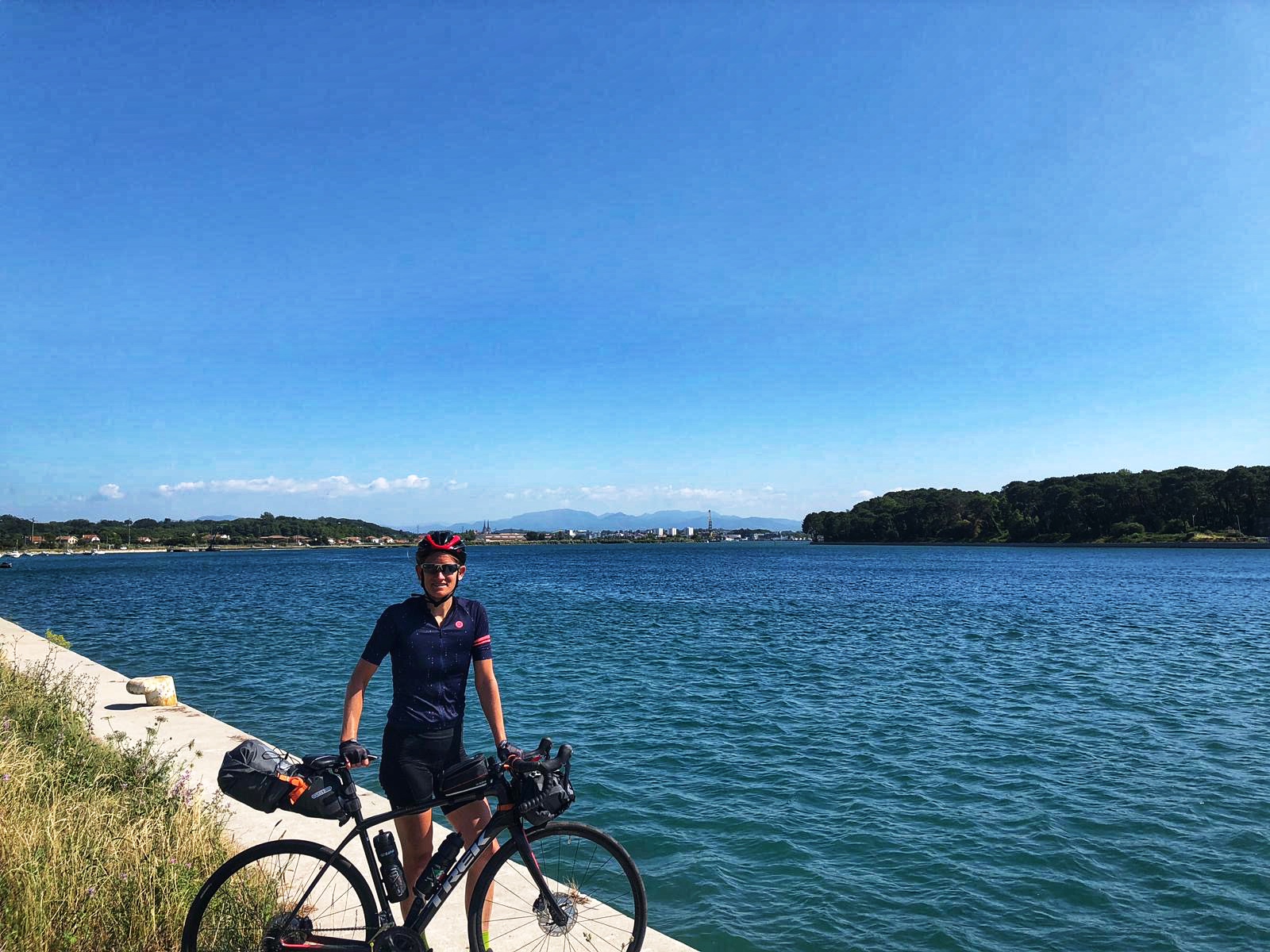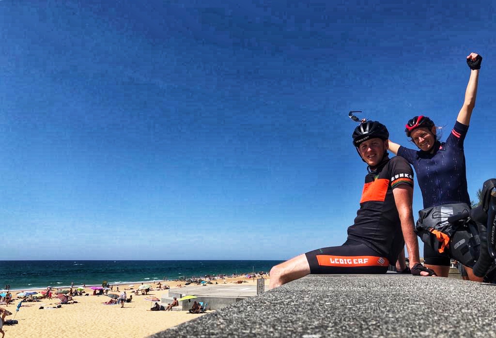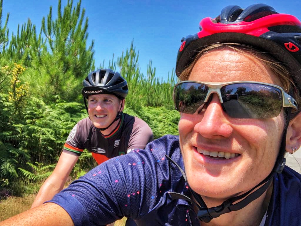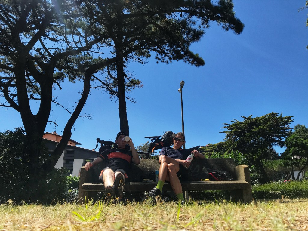 Bij Biscarrosse blijkt de weg door de duinen die we gevonden hadden over een kazerneterrein te lopen. We hadden al z’n voorgevoel en hadden voor de zekerheid een tweede route op onze wahoo gezet. De weg over het zelfde fietspad als gisteren, route Vélodyssée. Dit is een fietsroute vanuit Bretagne naar de Spaanse grens, precies de richting die wij uitgaan. Waar deze route gisteren zeer fijn was leidt deze nu via een hobbelige weg langs meren met campings. Niet heel fijn dus we besluiten waar het kan weer de originele route op te pakken. Dat doen we na onze eerste stop in Mimizan waar we water tanken en lunchen.