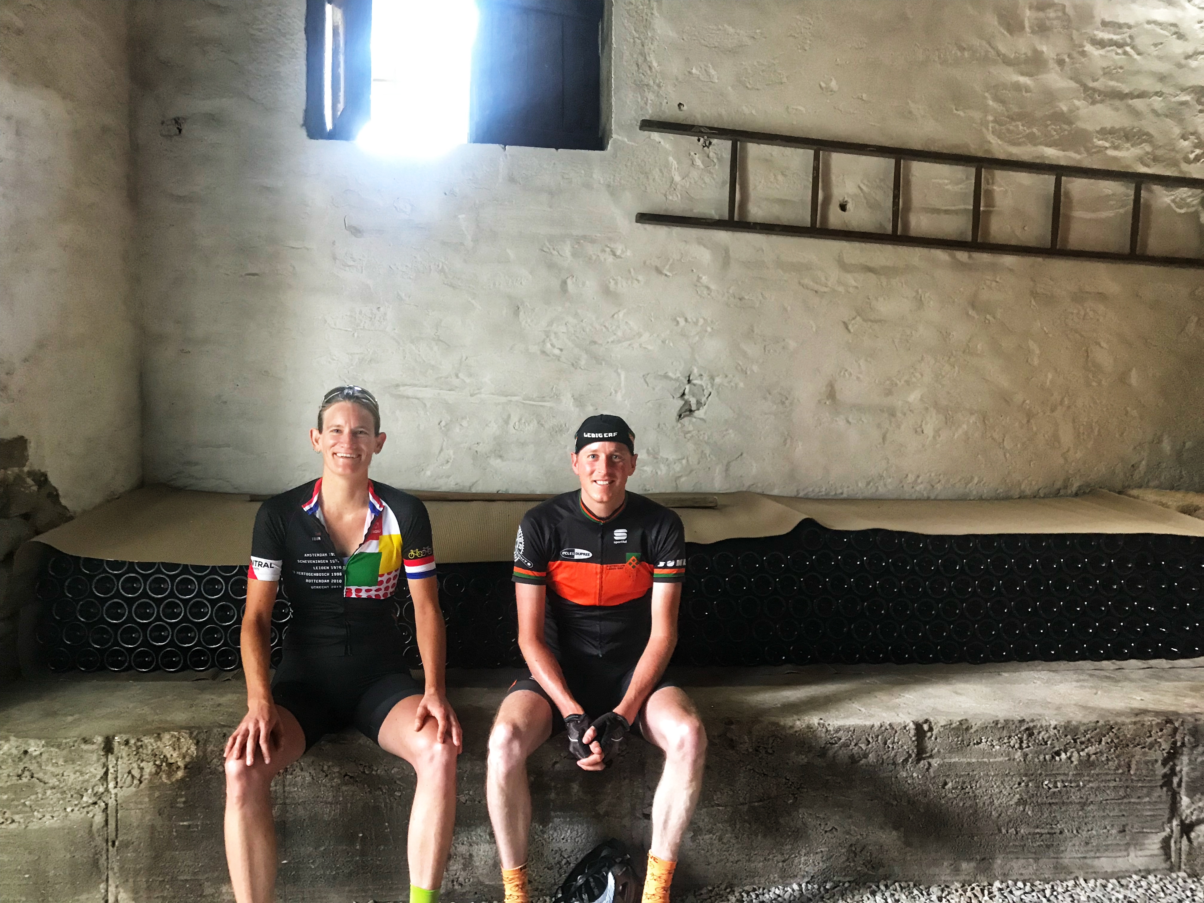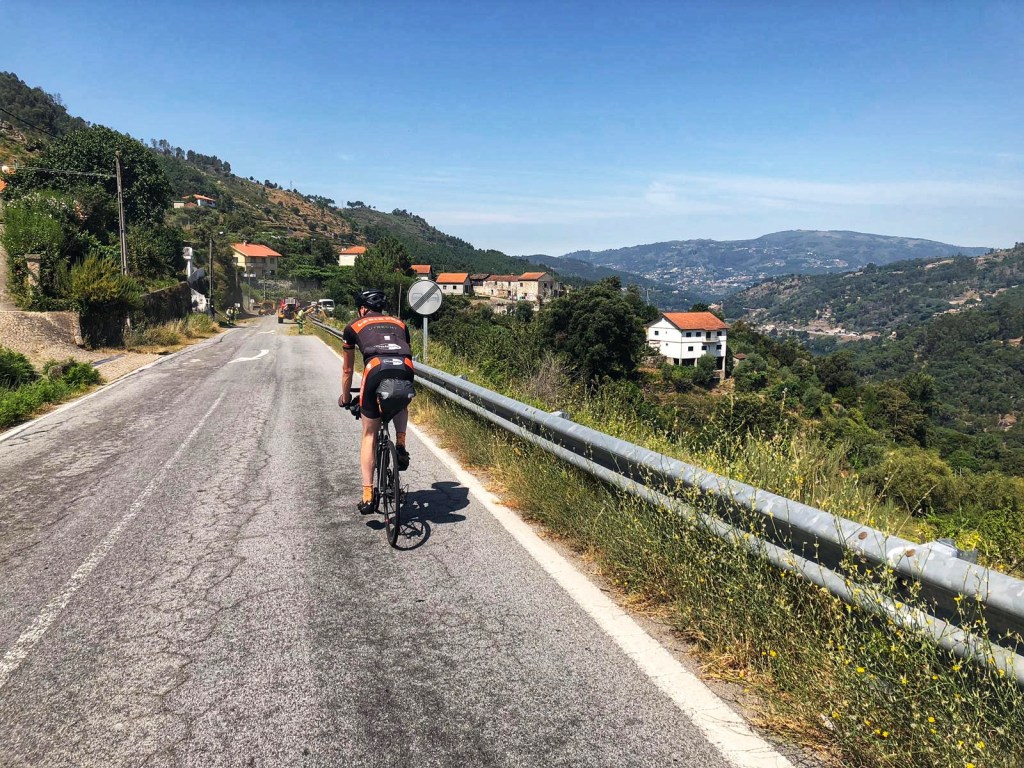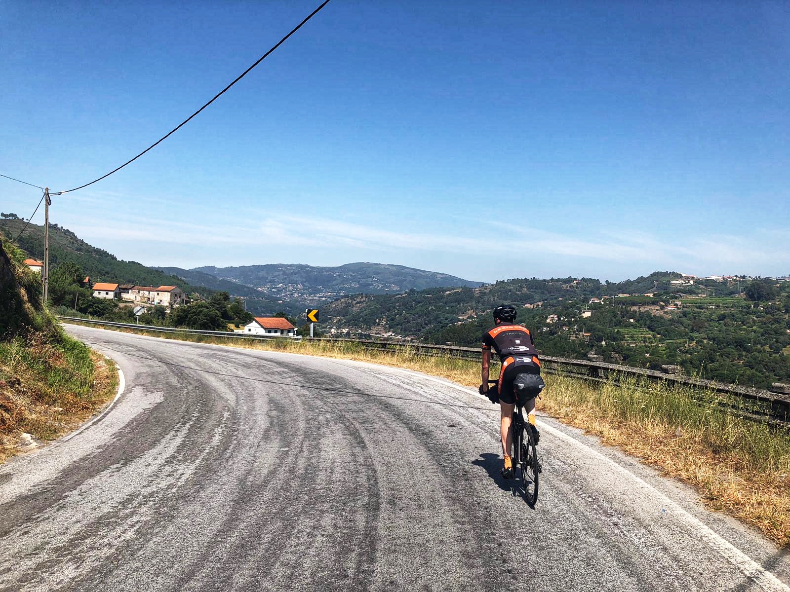Na de lunch vervolgen we nog even de route langs de rivier om deze vervolgens over te steken en naar een ander dal toe te klimmen. Het is warm maar het waait een beetje waardoor deze klim een stuk aangenamer is dan het klimmen gisteren. Snel zie ik de Douro kleiner worden en de weg waar we vandaan kwamen langer. Ik geniet van het klimmen en ben voor mijn gevoel snel boven. Op de top is een picknickplaats waar een familie uitgebreid zit te picknicken en kennelijk hebben ze ook wat te vieren want er wordt muziek gemaakt. Het ziet er erg gezellig uit.
