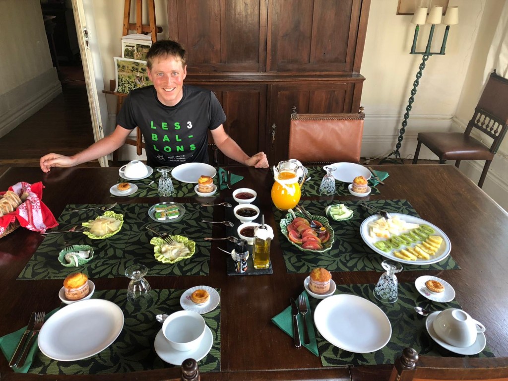 Weer helemaal bijgekomen. Air BnB waar we verblijven is een groot landhuis van een wijnboer. Er is veel fruit, we hebben gisteren goed en gezond gegeten en hebben af kunnen koelen aan het zwembad. Opgeladen en afgekoeld dus kunnen we er weer tegenaan. Eerst nog even ontbijten. Onze host haalt er erg veel voldoening uit om voor ons te zorgen en dat merken we aan de uitgebreide ontbijttafel met regionale en eigen gemaakte producten: kazen, zelf gemaakte jams, tomaten fruit uit eigen tuin, verse jus uit eigen tuin, twee soorten brood, pasteis de nata en een Portugese muffin.