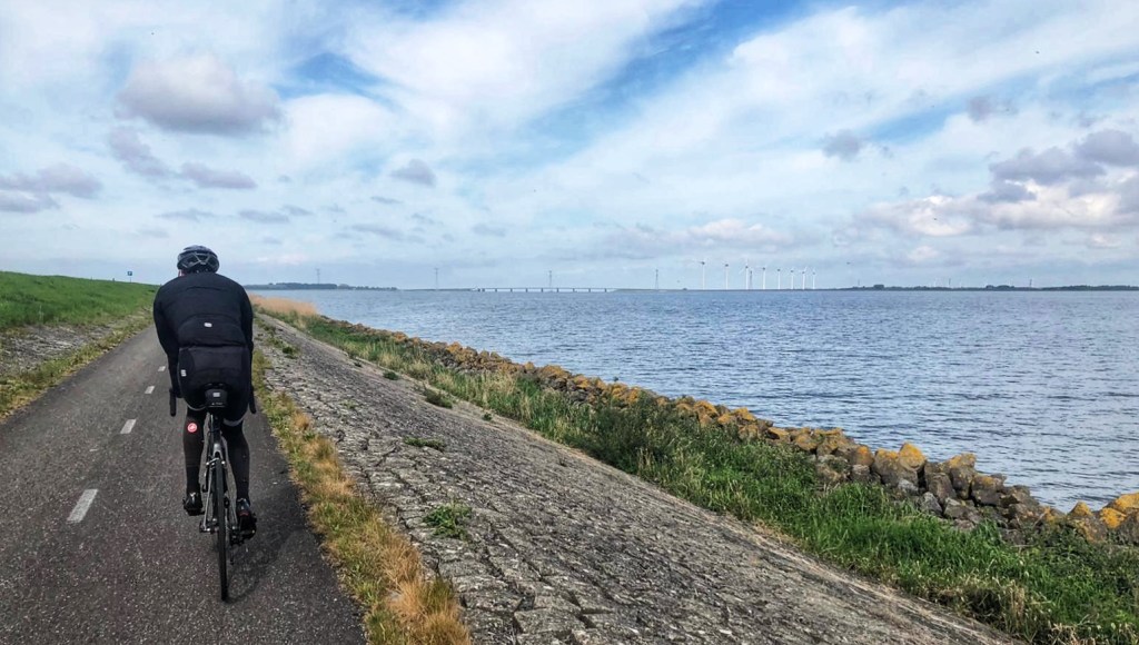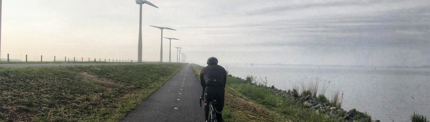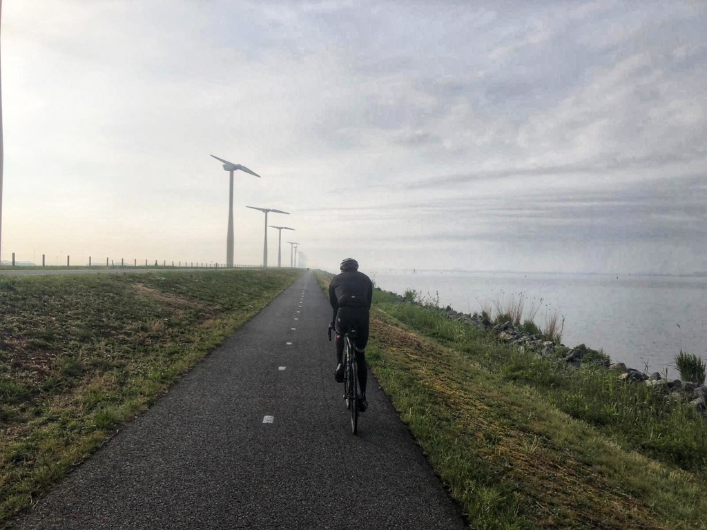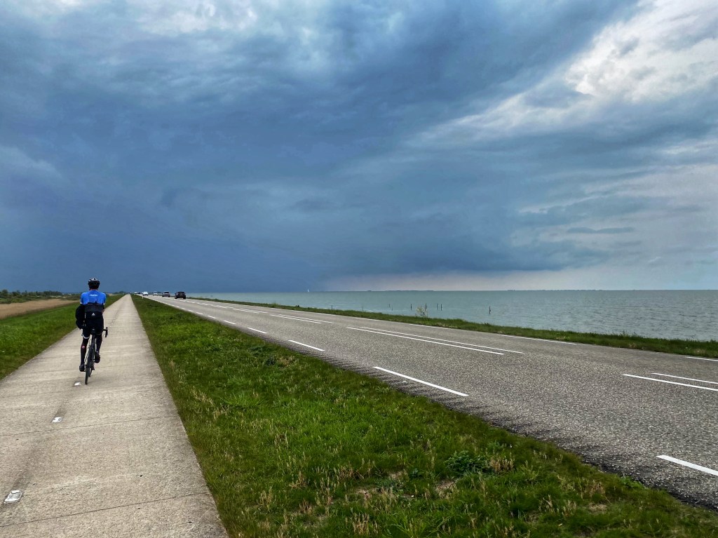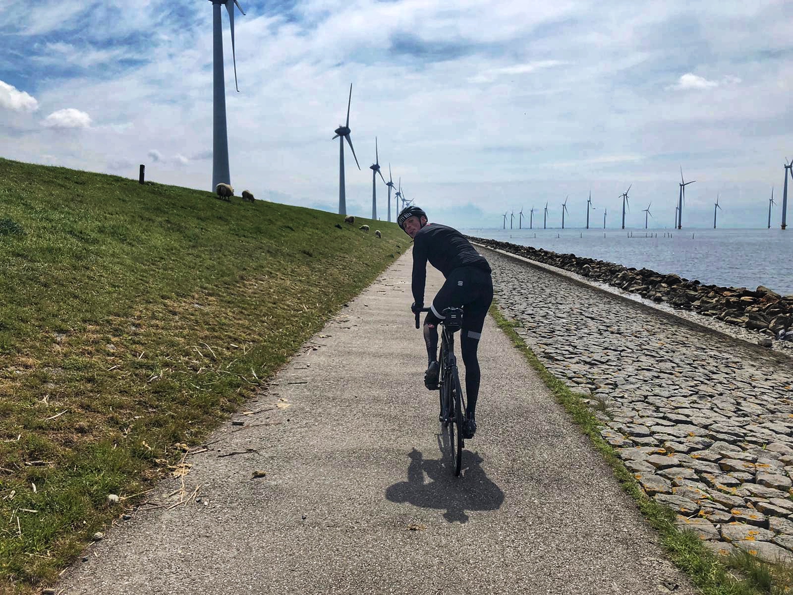 Nadat de weg naar links draait en het Veluwemeer plaats maakt voor het ketelmeer wordt het beter. We komen wereldkampioen handcycling Tim de Vries tegen die vertelt dat hij ook bezig is met rondje polder maar er nog over nadenkt via de houtribdijk terug te gaan. Met speels gemak haalt hij ons daarna in, respect.