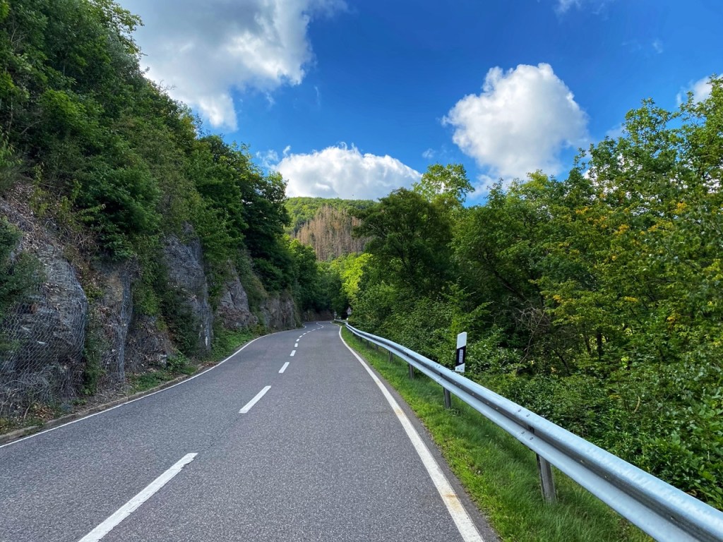 Boven komen we op een splitsing en dalen we af naar Gemünd. Afdaling van een klim die we gisteren hebben gedaan. Beneden in het dorp gaan we via een nieuwe route naar Dreiborn. Geen heel mooie klim maar we blijven lang boven de 500 meter waardoor we boven vele uitzichten hebben.