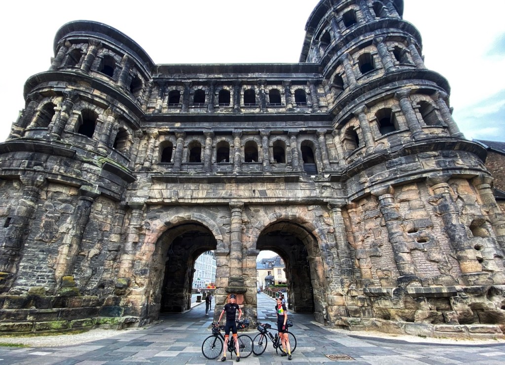 Dan komen we op een grotere weg, nog steeds in het bos maar het wordt drukker en even later zitten we in de voorstadjes van Trier. Langs de Moezel rijden we tegen het e-bike verkeer in Trier binnen. Waar we via de binnenstad en haar highlights – Porta Negra, Basilica van Constantijn, Sint-Matthiasabdij en de Sint-Gangolfkerk – naar de fietsenmaker rijden.