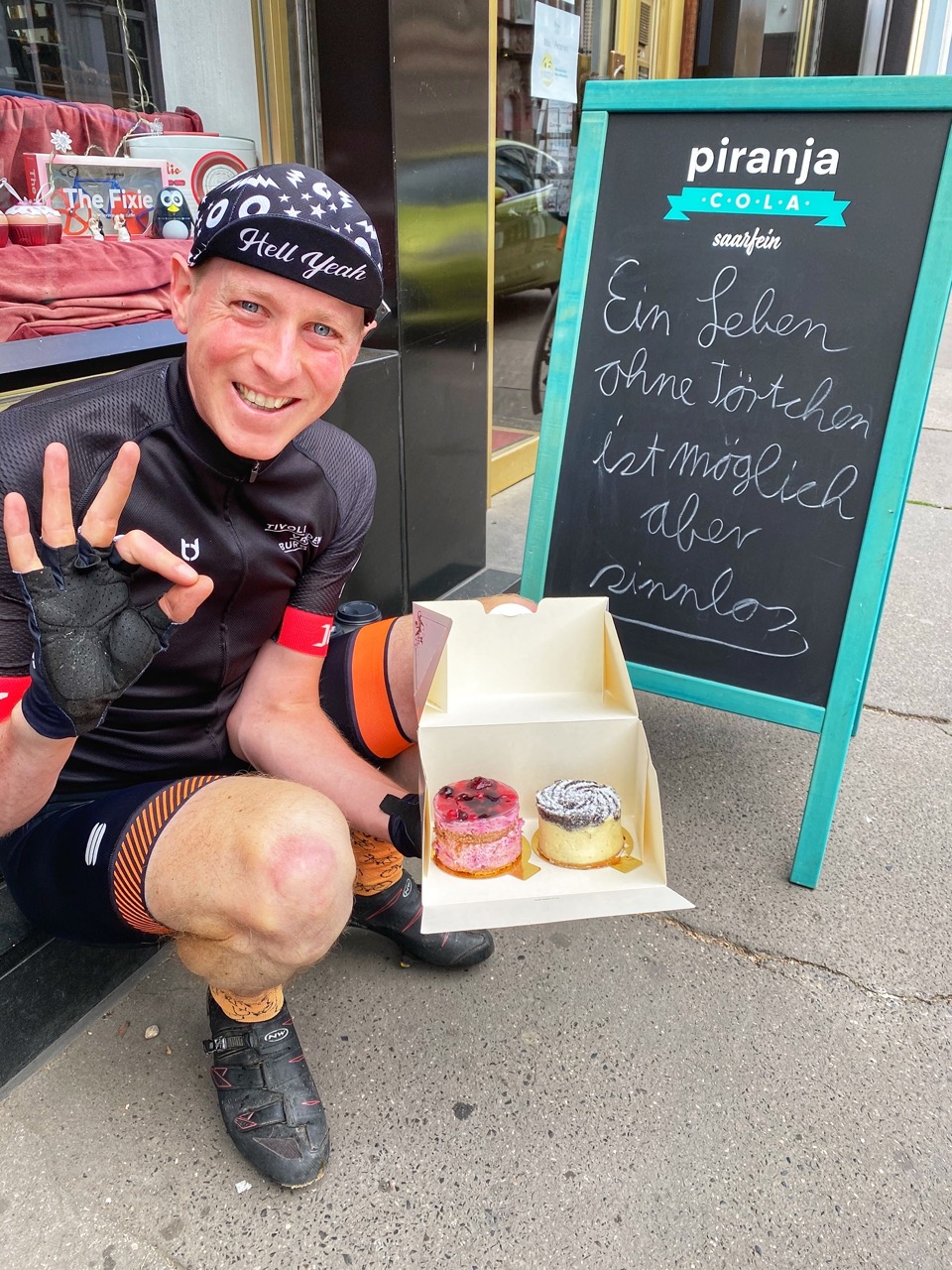 Bij de fietsenmaker worden we meteen geholpen en kunnen sneller weg dan gepland. Tijd over betekent tijd voor Kaffee Und Kuchen. Ik sta al gapend bij een bakker naar binnen te kijken als Francien en taartenwinkel opmerkt. Slogan van die tent “Ein leben ohne törtchen ist möglich aber sinnlos”. Nou dan weet je het wel.