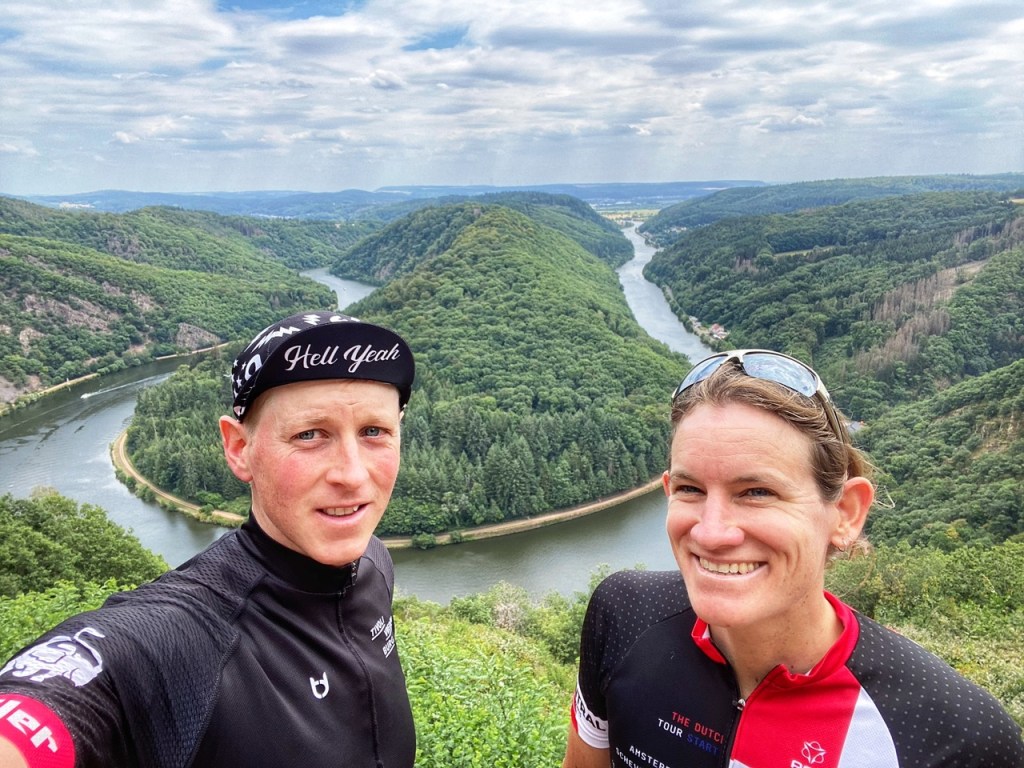 Na een kilometer of 15 is het gedaan met de vlakte en mogen we gaan klimmen. Want we willen naar een uitzicht punt voor de Saar de beroemde Saarschleife. Voor we daar zijn eerst een pittige klim. Helemaal geen zin in maar een bekend wielrenner zei volgens mij ooit “al doen de benen nog z’n pijn, voor uitzicht moet je boven zijn.”