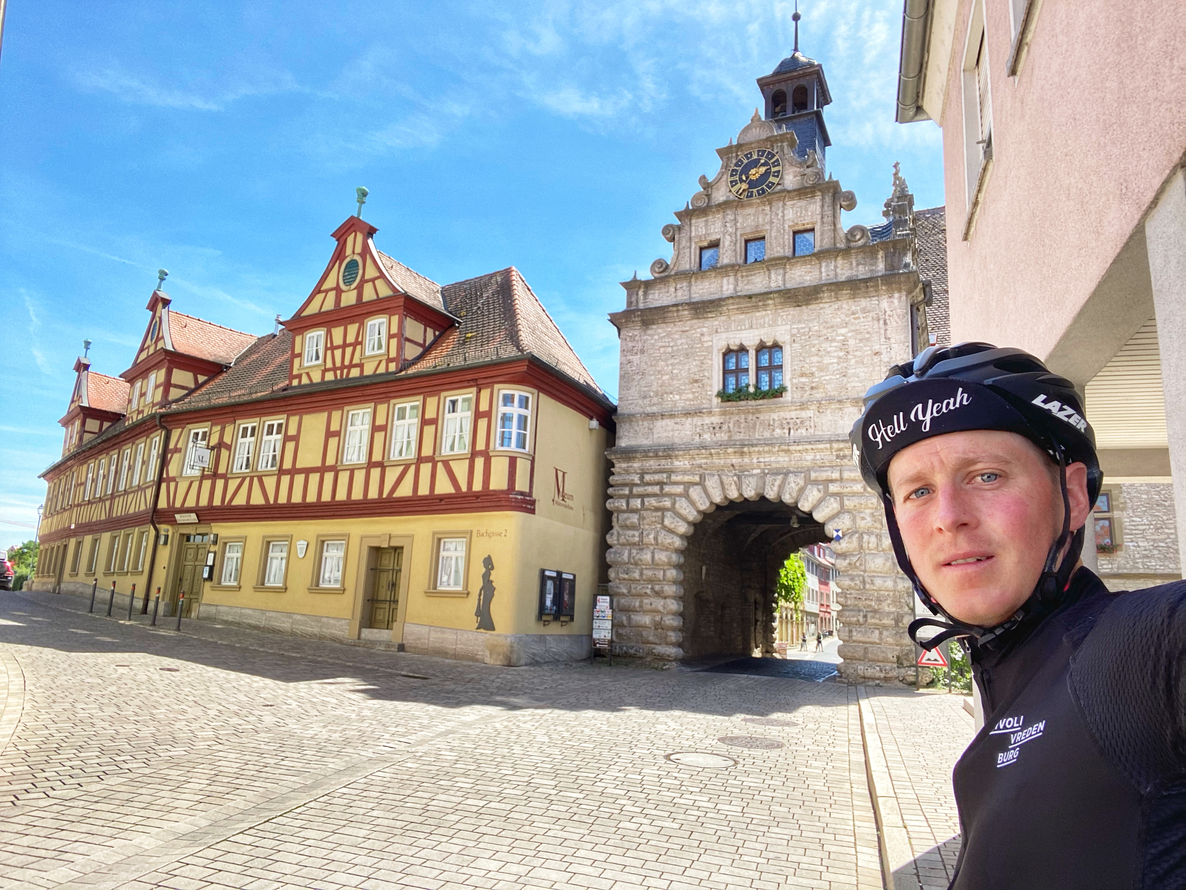 Vanaf hier klimmen we gestaag naar het Steigerwald. Het eerste stukje langs het stroompje Breitbach Mühlgraben. Bij Tiefenstockenheim slaan we rechtsaf en gaan we verder omhoog. Nét aan de klim begonnen horen we sirenes, geen idee wat dit betekent, maar als we doorrijden zien we rook, en hoe hoger we komen of hoe langer het duurt, steeds meer rook. Wat er in de fik staat weten we niet, want we rijden het dal uit, maar dat het serieus is blijkt als iets later twee brandweerwagens ons met volle vaart tegenmoet komen.