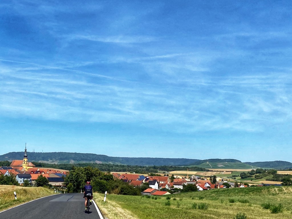 Het is al na een uur en we krijgen trek. Tijd om een bakkerij te vinden. We komen door mooie kleine plaatsjes als Unter- en Oberbalbach en Wolkshausen maar hier is niets meer dan een kerk en wat huizen. We gaan per saldo vooral omlaag op dit stuk en het geeft dus niets dat we even op de lunch moeten wachten. In Gauköningshofen vinden we een bakker, die ook meteen ook de slager, posterij en belangrijkste ontmoetingsplek van de omgeving is. Tussen het Beiers geouwehoer zitten we binnen no time weer aan de Schnecke.