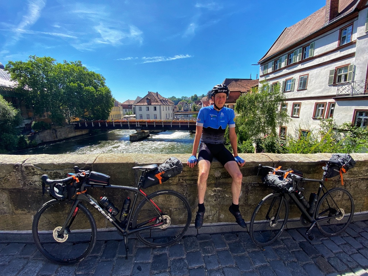 In de buurt van Bamberg wordt het drukker. Maar via een fijne fietsroute zijn we zo in de fraaie binnenstad. Eerste waar we heen gaan is Schlenkerla, de historische Rauchbierbrauerei. Te vroeg voor bier nog helaas, al denken sommige toeristen daar anders over. Vanuit hier maken we een korte fietstour door de stad. Mooiste uit de stad is het Altes Rathaus, dat een soort poort is over de Regnitz en prachtige fresco’s op haar gevel heeft. Dat het een mooie stad is denken meer mensen wat het is druk dus besluiten we snel door te fietsen en aan de rand van de stad te lunchen. Uiteraard met Bretzels, Kaffee und Schnecke.