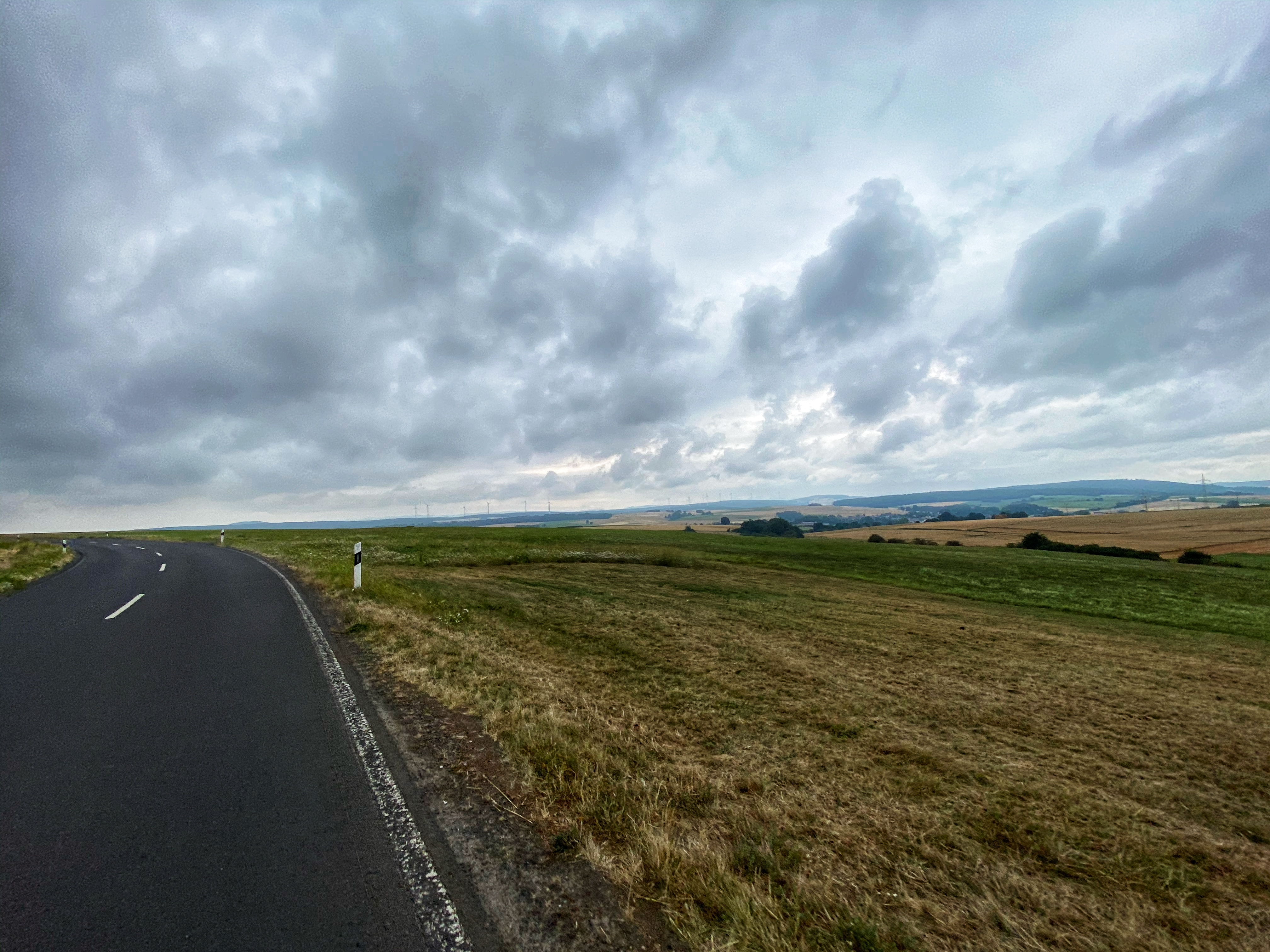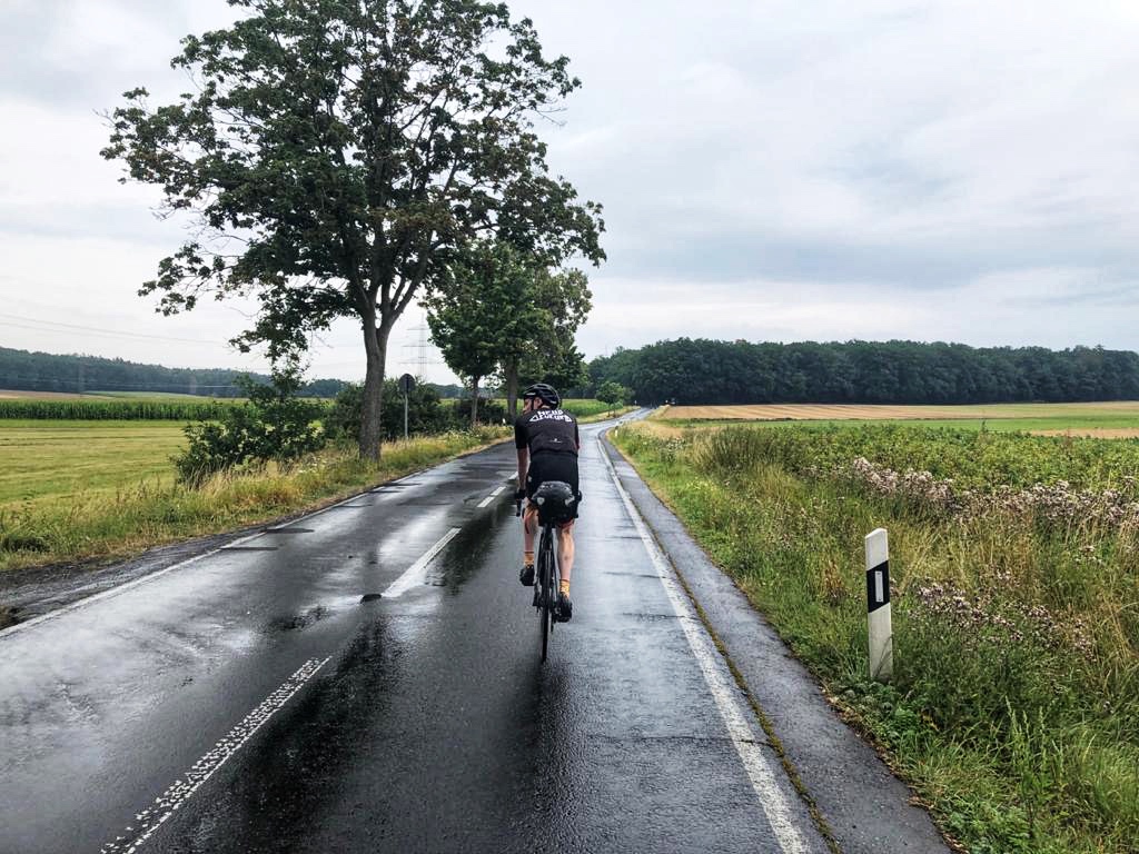 We vertrekken uit Alsfeld en op het heuveltje buiten de stad zien we dat het een grijze dag gaat worden. Het is droog, maar ziet er dreigend uit. We dalen af en komen in de vlakte. Fijne fietspaden, leeg en verlaten is het. De zondagsrust of komt er dan toch nog regen aan? In Ziegenhain krijgen we het antwoord in de vorm van een hevige bui. Net op tijd vinden we een plek om te schuilen. Ook deze bui is kort dus we zetten snel weer voort. Bovendien zijn we niet van suiker.