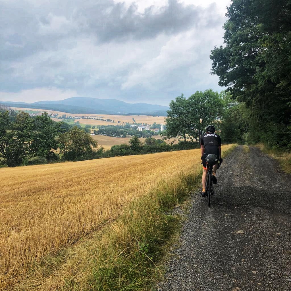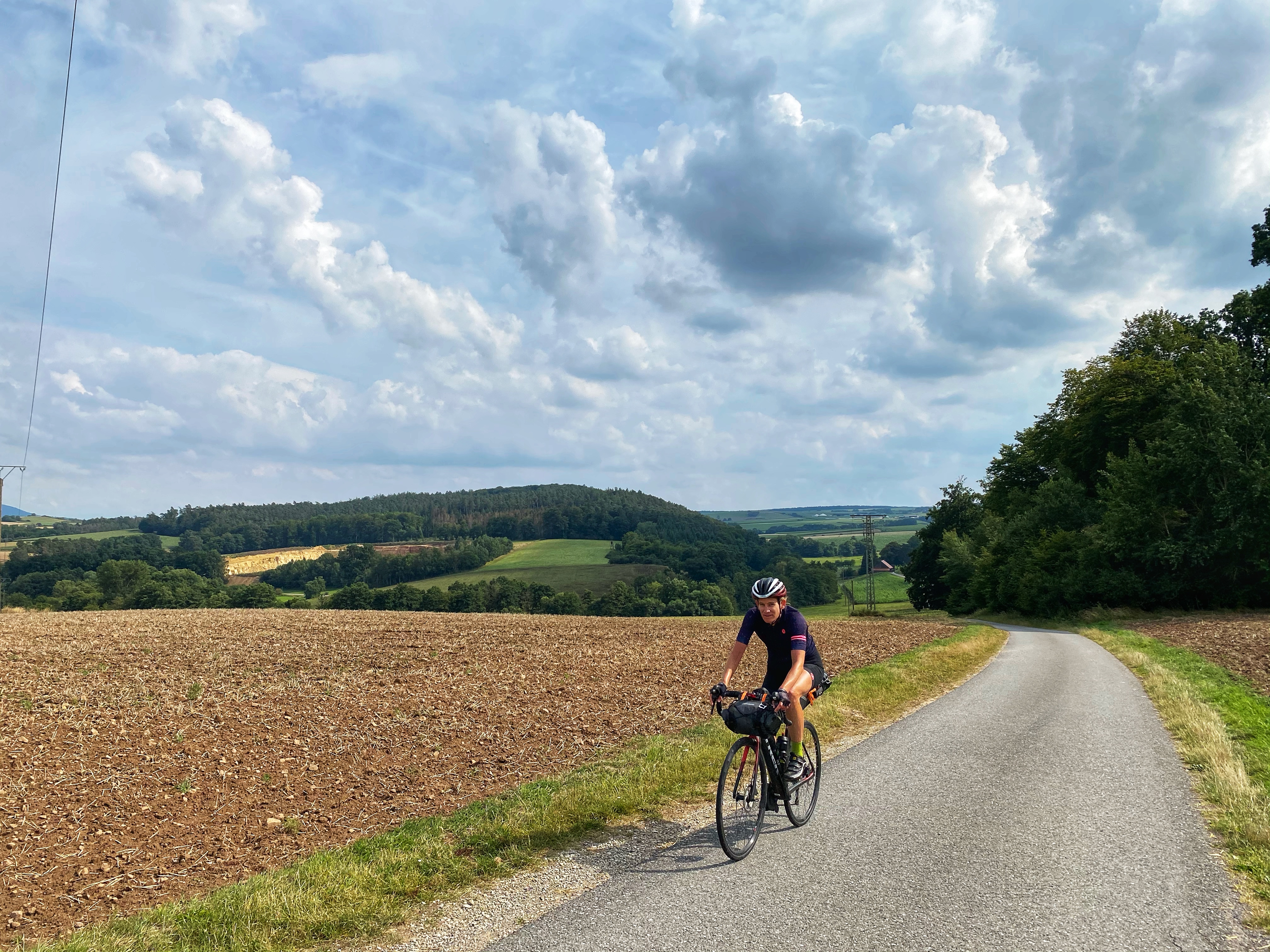 Tot Bad Zwesten blijft het vlak, in de verte heuvels waar ook wolken in lijken te blijven hangen. Doordat we veel fietspaden hebben schiet het erg op.
