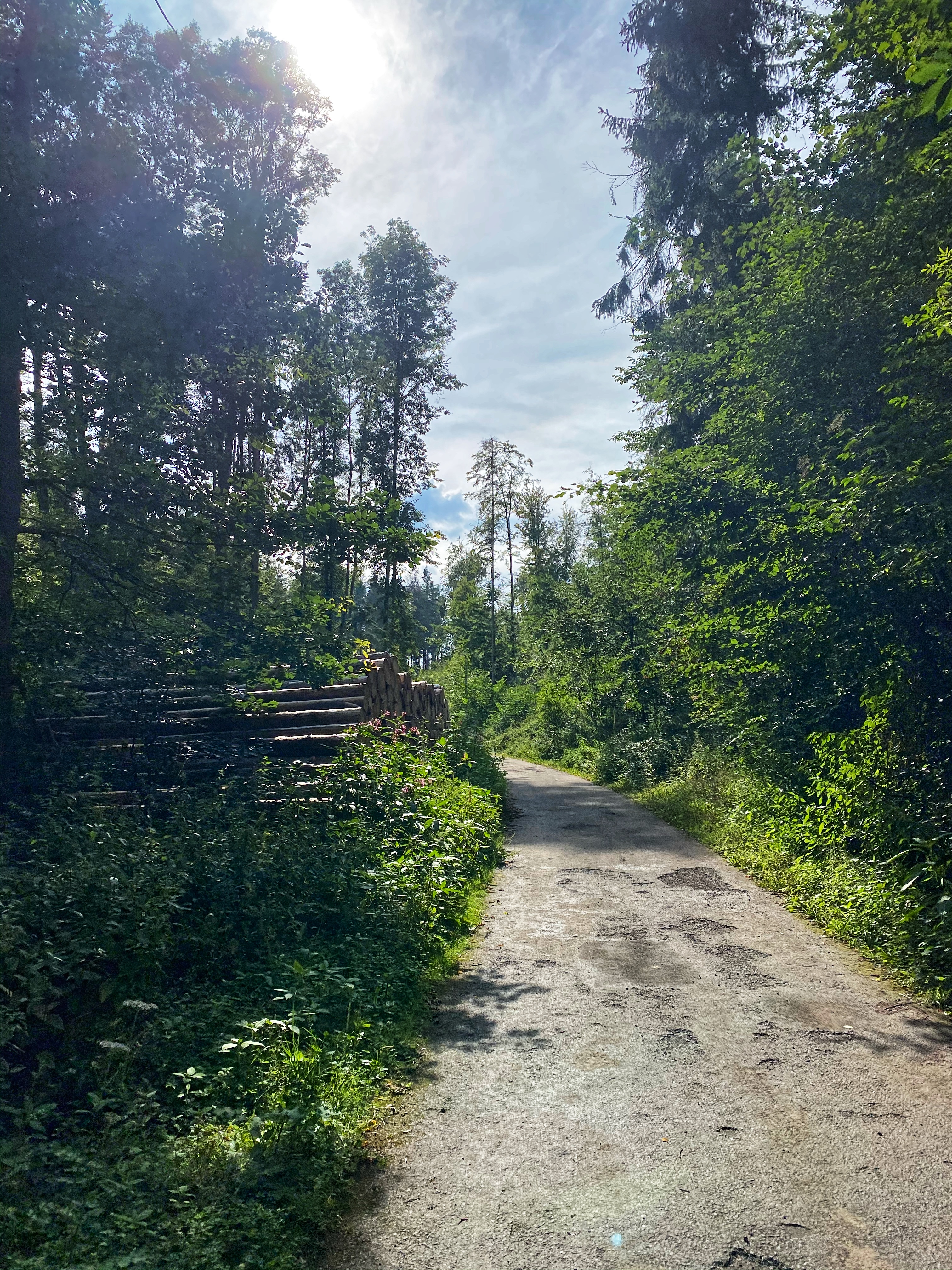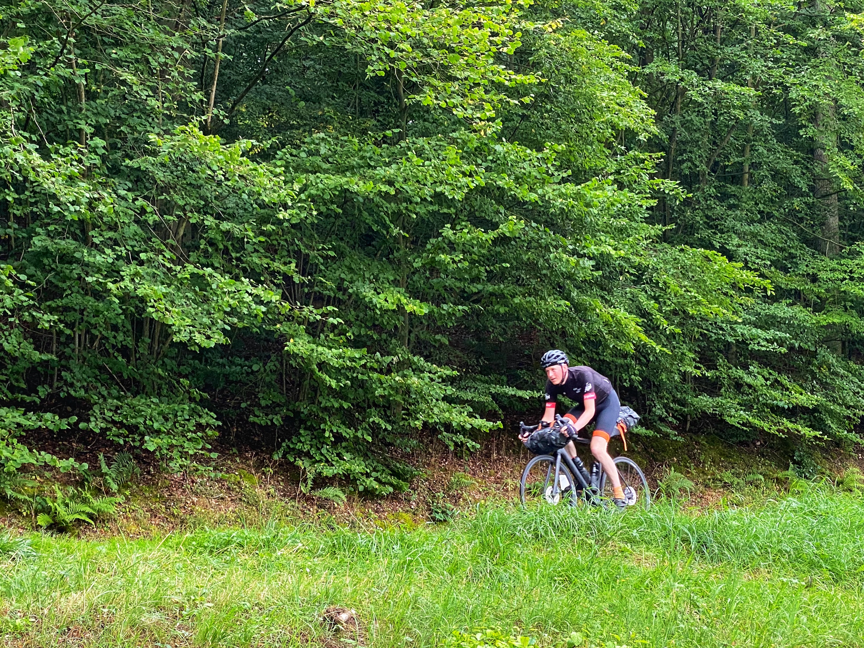 Laatste klim gaat door het bos op een L weg die redelijk rustig is. Omdat het geregend heeft ruik je de lucht van de dennenbomen goed. Lekker.