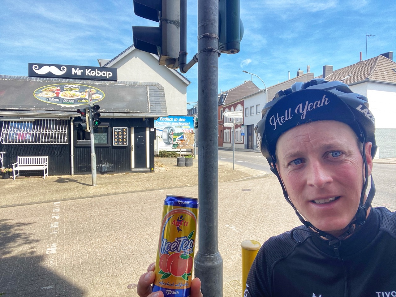 In Weiden nog even stoppen voor wat extra vocht in de vorm van een ice tea bij Mr. Kebab en door voor de laatste Duitse loodjes om bij Vaals Nederland weer binnen te rijden. Daar zitten Marieke en Karlijn op het terras op ons te wachten en kunnen we aan de verlate lunch: vlaai en ijs en bitter lemon en bitter lemon.