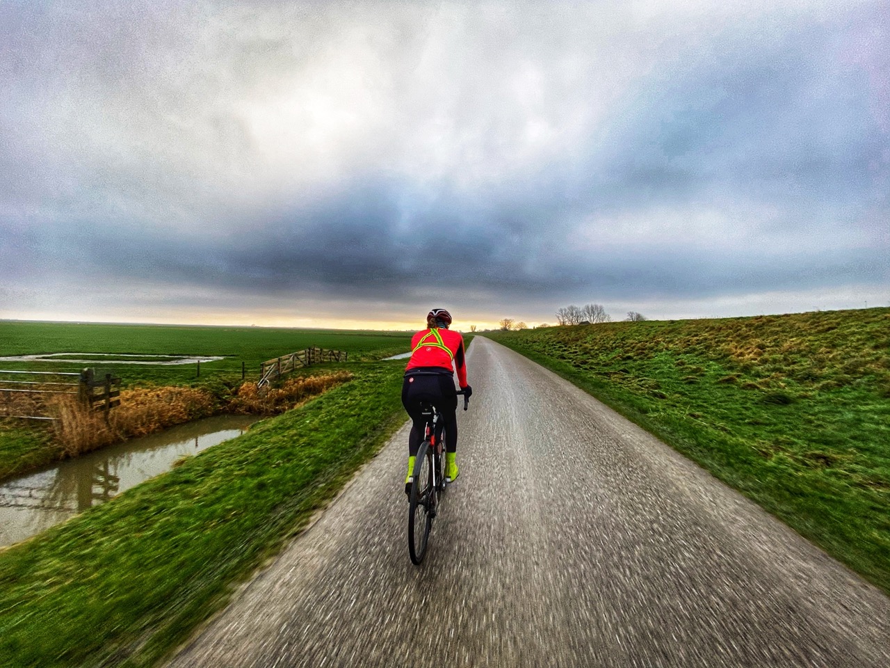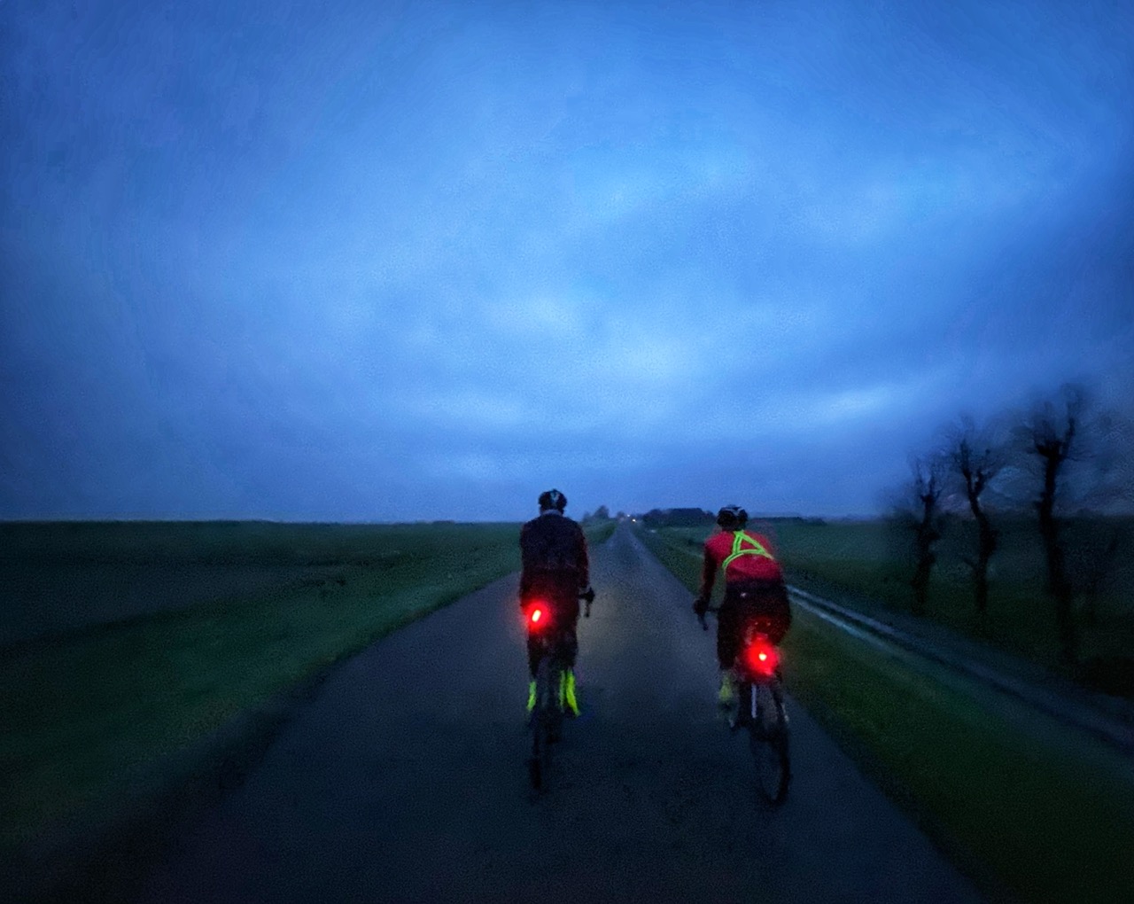 Vanaf hier begint het ook snel donker te worden. Zonsondergang langs het stroompje de Lende is prachtig maar even stoppen om er een foto van te maken durf ik niet meer. Ik blijf op ruime afstand achter Eelke en Francien rijden. Gelukkig zijn de wegen rustig en kan ik door blijven trappen.