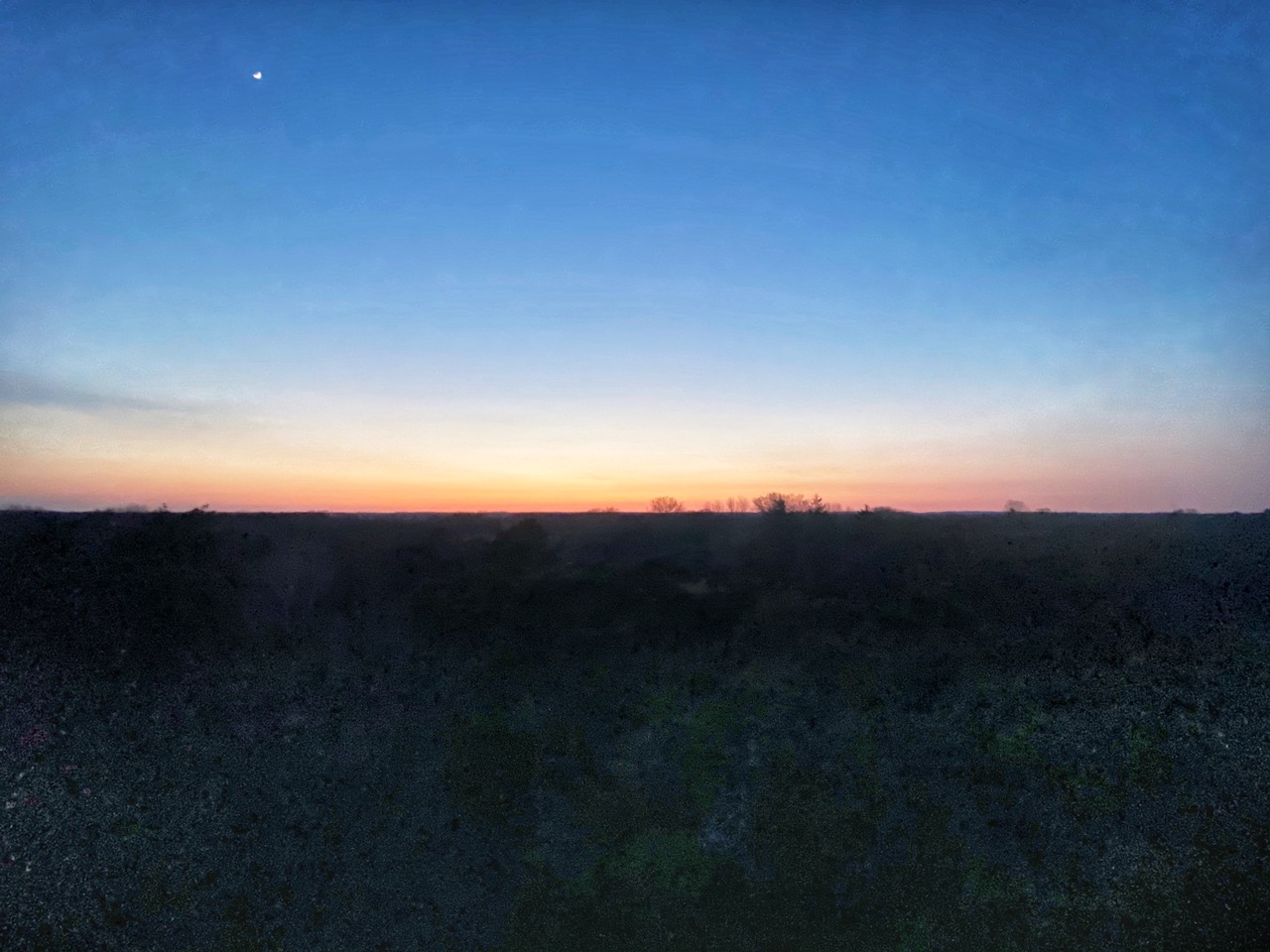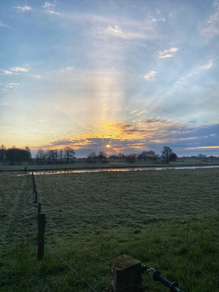 In de buurt van Hardenberg komt de zon op. Het is jammer dat het landschap hier niet meer bestaat uit natuurgebieden, maar vooral landbouwgrond. Iets minder idyllisch, maar de zonsopgang is toch mooi. Vooral ook prettig, want de -7 die mijn wahoo eerder aangaf gaat nu langzaam richting de plus.