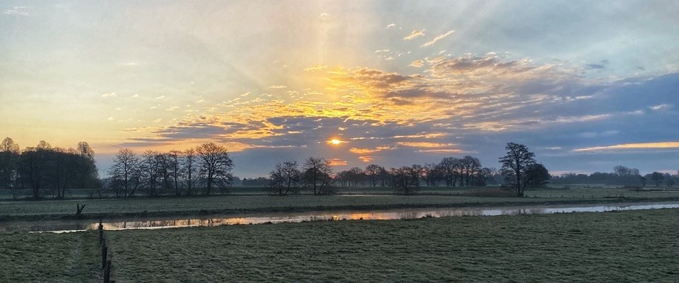 Bij Holtheme, waar de Overijsselse Vecht Nederland binnenkomt, stop ik even. Ik vind deze rivier één van de mooiere in ons land en omdat de zon hier door begint te breken maak ik even van de gelegenheid gebruik hier een foto van te maken en dit stukje landschap goed in me op te nemen. Het is prachtig met de dauw die hier nog over de velden hangt.