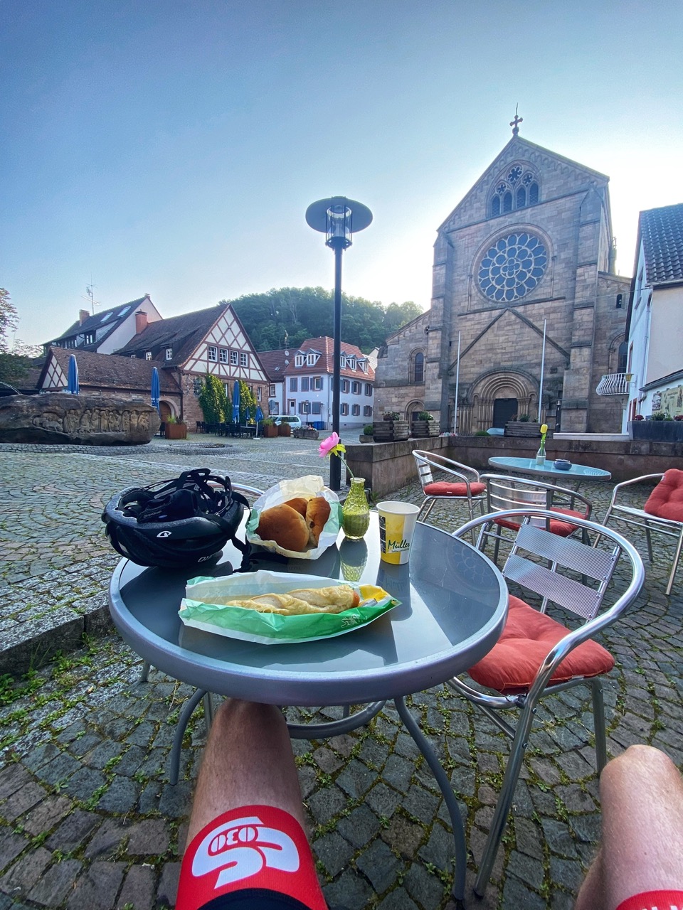 Voor ik ga klimmen nog even een Kirschstreusel en een Eiskaffee naar binnen want lunchen bij een Duitse bakker sla ik niet graag over. En de lunch is nodig want er staan drie klimmen op het programma.