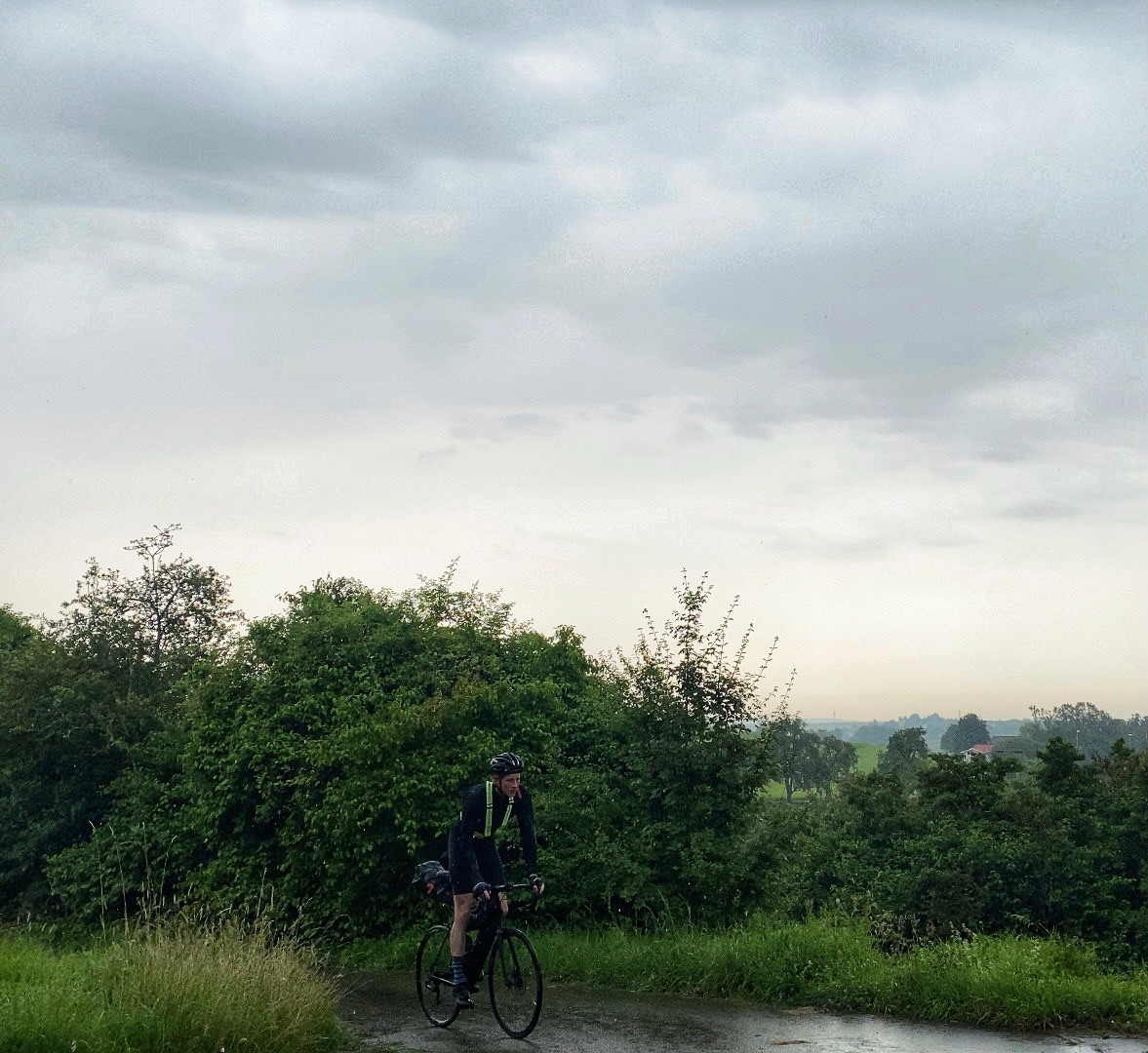 Ik zit nog maar net op de fiets of de eerste druppels vallen. In het Oosten zie ik drogere lucht dus ik blijf fietsen. Mijn geplande ontbijt locatie sla ik over en ik neem even een noodreepje. Vijf minuten later wordt ik toch nat en heb ik even spijt. Even maar want weer vijf minuten later is het droog. Blijf nog even doorrijden want wil niet dat de bui me inhaalt.