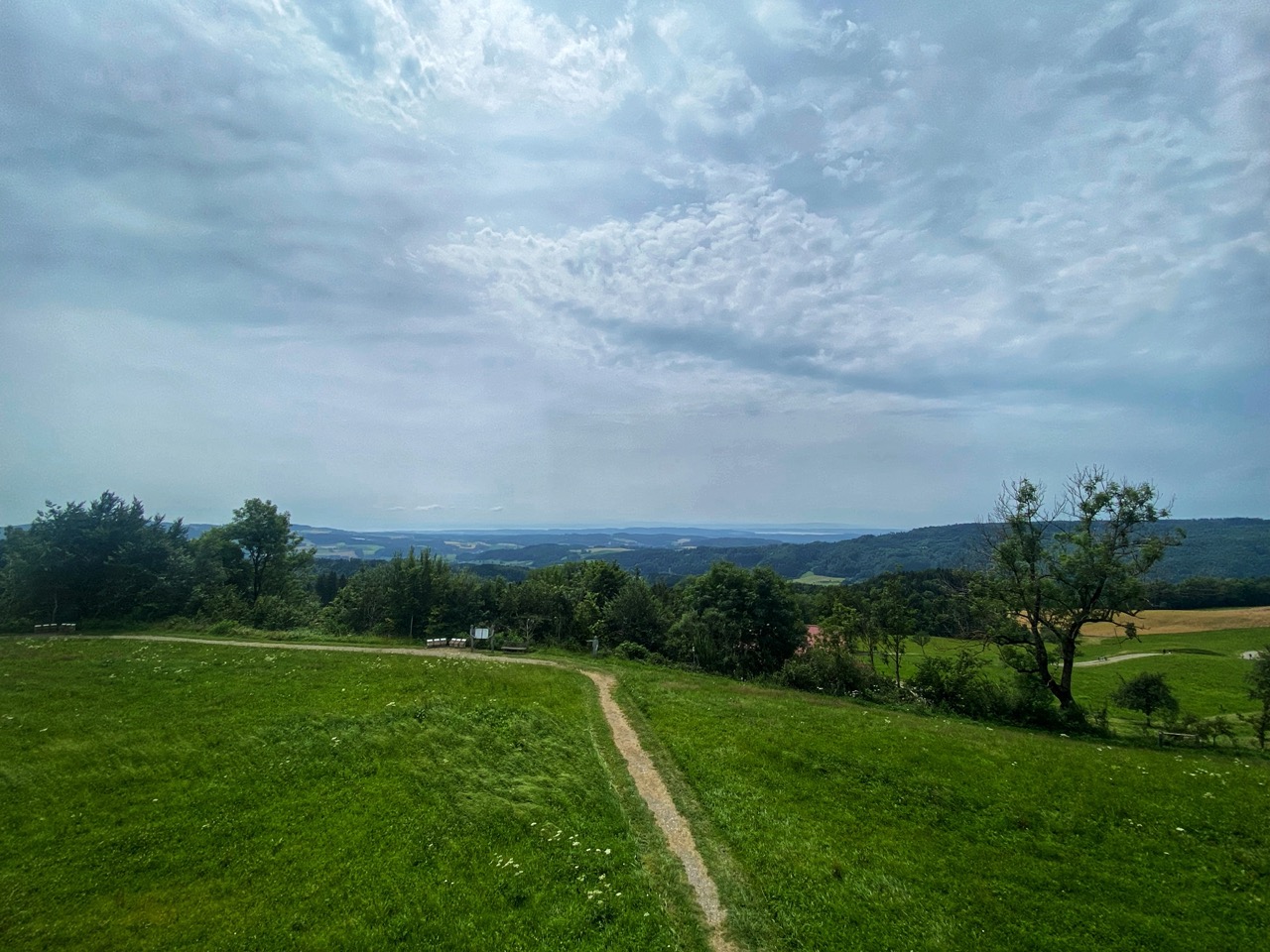 Ik rij door en zie dat ik de dreigende wolken achter me aan het laten ben. Dat lucht op en geeft ruimte om weer te genieten van de omgeving. De route gaat door heuvels van Kreiss Bodensee en Höchsten, wat ongetwijfeld naar het hoogte punt in de omgeving verwijst, geniet ik van het uitzicht. Zie de Bodensee met op de achtergrond de Alpen.