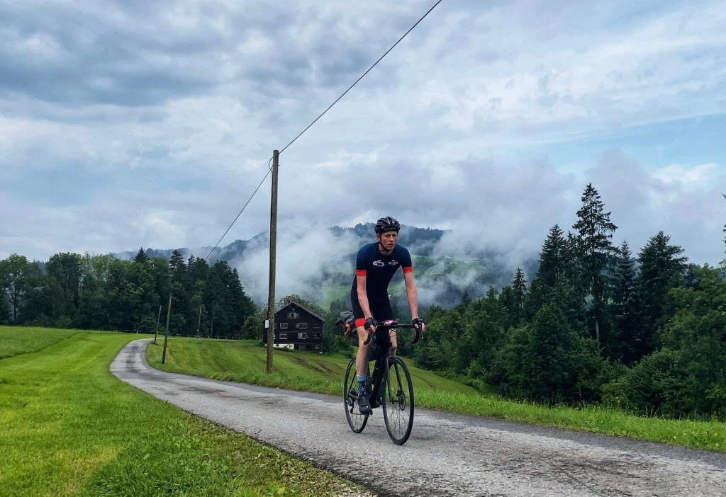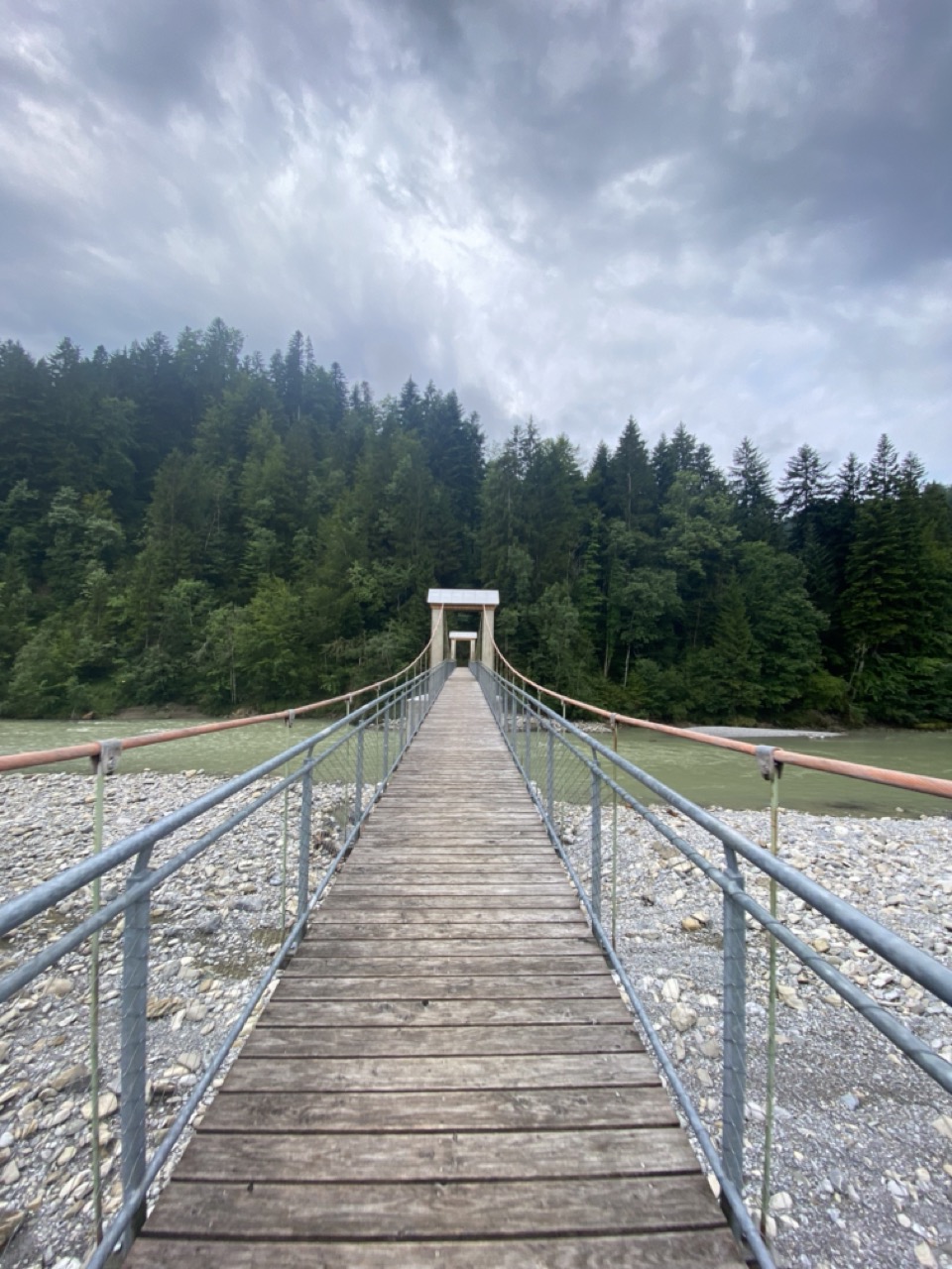 Ik daal helemaal af tot aan het riviertje de Bregenzer Ach. Aan de oever hiervan loopt een gravelpad wat helaas versperd is. Dat betekend dat ik mijn route moet omgooien. Ik zie op de kaart een geweldige hangbrug 2 km verderop en besluit daar de rivier over te steken. Prachtige brug alleen het pad aan de andere kant is een wandelpad. Ik besluit voor een stukje hike & bike te gaan in plaats van om te keren. Erg fijn is het niet maar als ik tussen de koeien weer op de gewone weg kom ben ik die kilometer wandelen alweer vergeten.