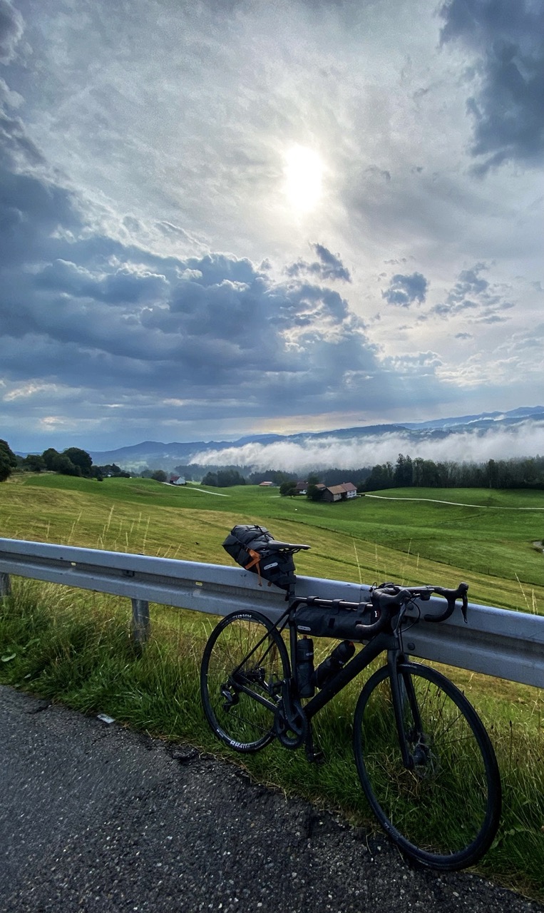 Beneden scheiden onze wegen en heb ik mezelf nog getrakteerd op een ommetje met een klim die voortduren boven de 10% is. Niet echt prettig voor de benen maar wel geweldig uitzicht over de Oostenrijkse steden aan de Bodensee.