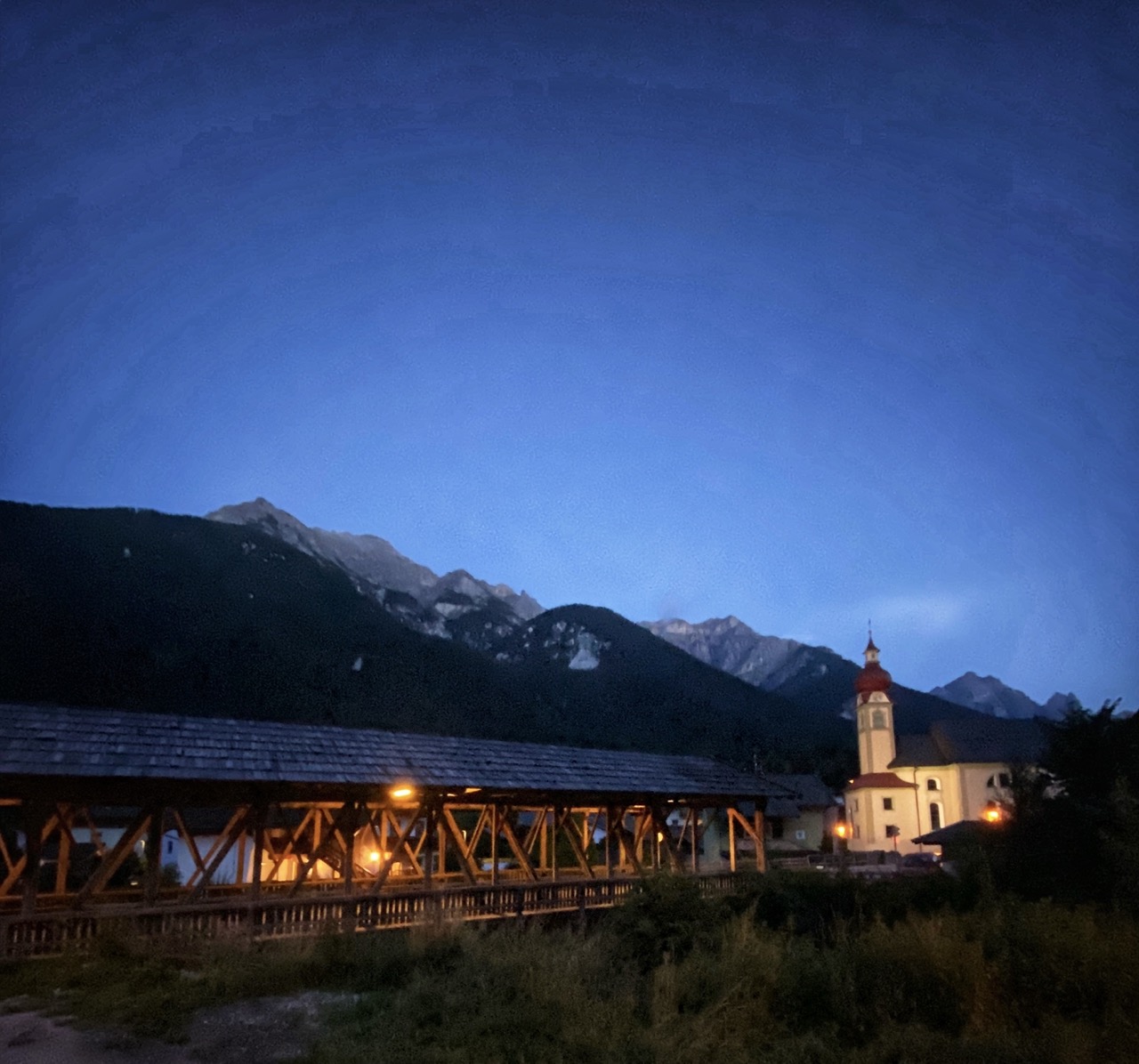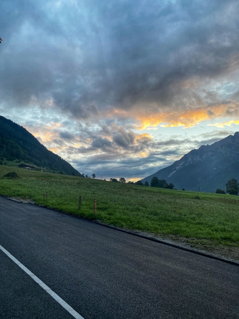 Om 6 uur gaat hier de zon op en ik zorg dat ik dan ook op de fiets zit. Ook niet onbelangrijk: het tijdstip dat de bakker om de hoek open gaat voor wat broodjes voor onderweg. Dan fietsen. Eerst het Stubaital uit richting Brenner. Het dal uit is richting het oosten waardoor ik de zon prachtig zie opkomen.