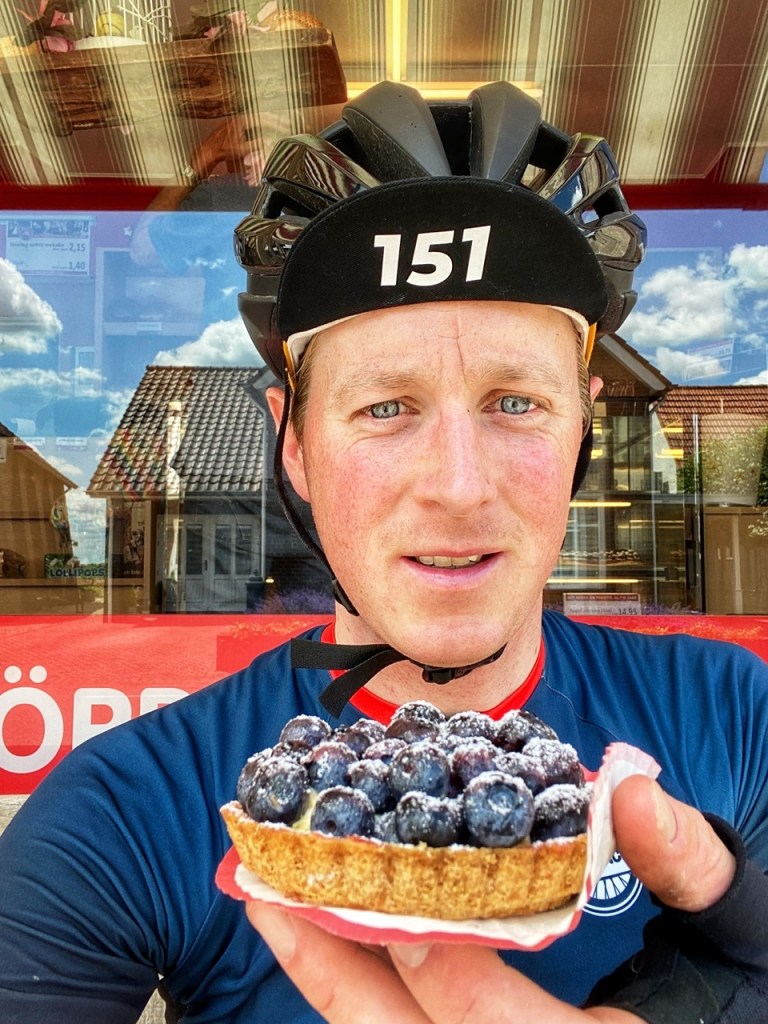 Het is na vieren en ik besef me dat ik nog een stuk of vijf reepjes tekort ga komen tot het einde van de rit. Dat betekent dat ik nog even een kleine boodschap moet doen. Bij het eerste tankstation dat ik vind is de keuze wel heel minimaal. Voor chocola is het te warm, dat smelt meteen en de alternatieven zijn te slecht. Ik besluit toch maar iets te kopen en in Vaals nog een poging te wagen. Daar vind ik een mega supermarkt maar zie ik niet waar ik veilig mijn fiets weg kan zetten dus ik ga voor de Turkse winkel om de hoek. Echt veel keuze heb ik niet maar de vriendelijke eigenaresse biedt me wel een smoothie aan. Die is te gek en met een pak koekjes erbij zou ik de laatste 175 km wel moeten redden.