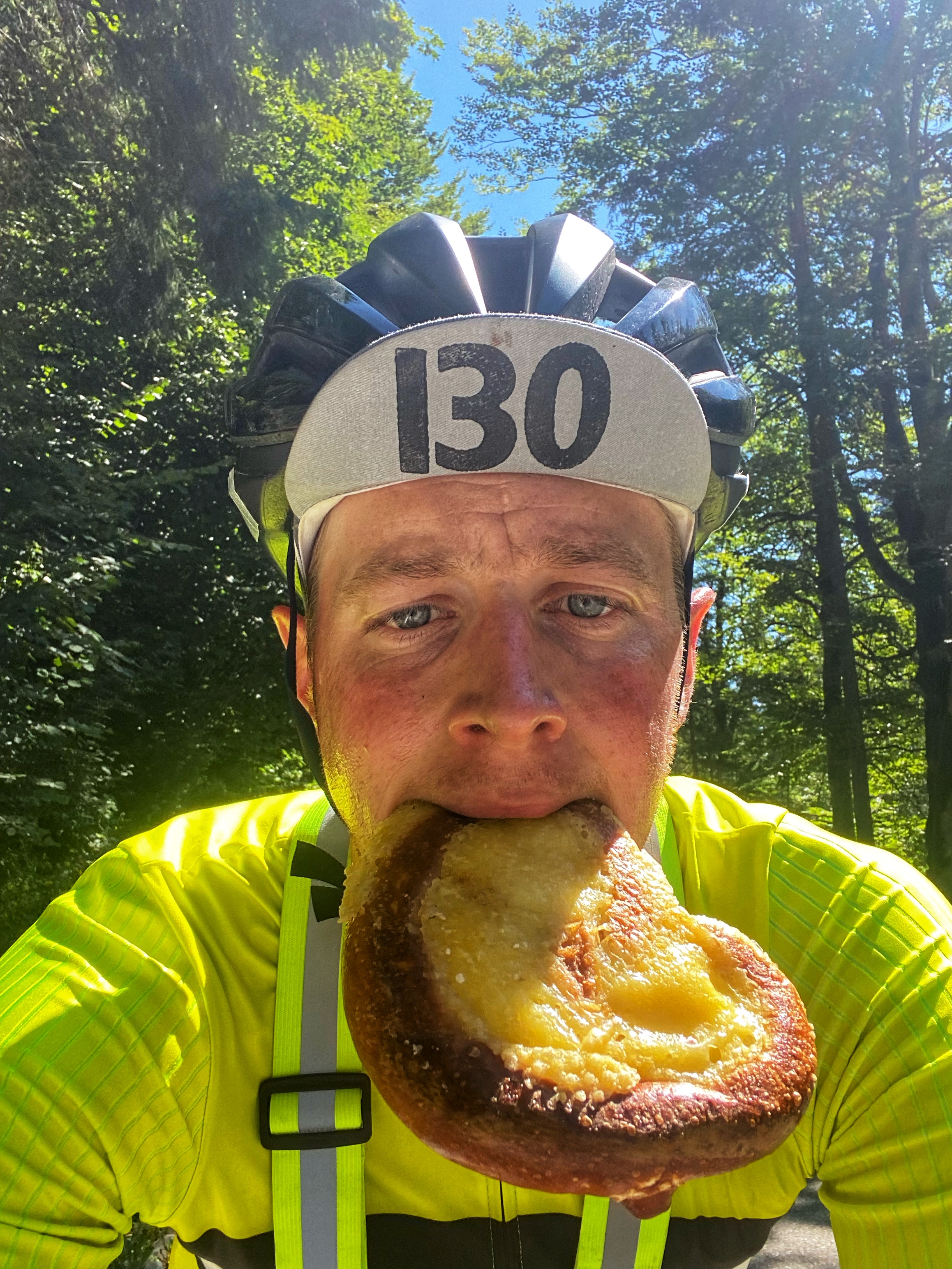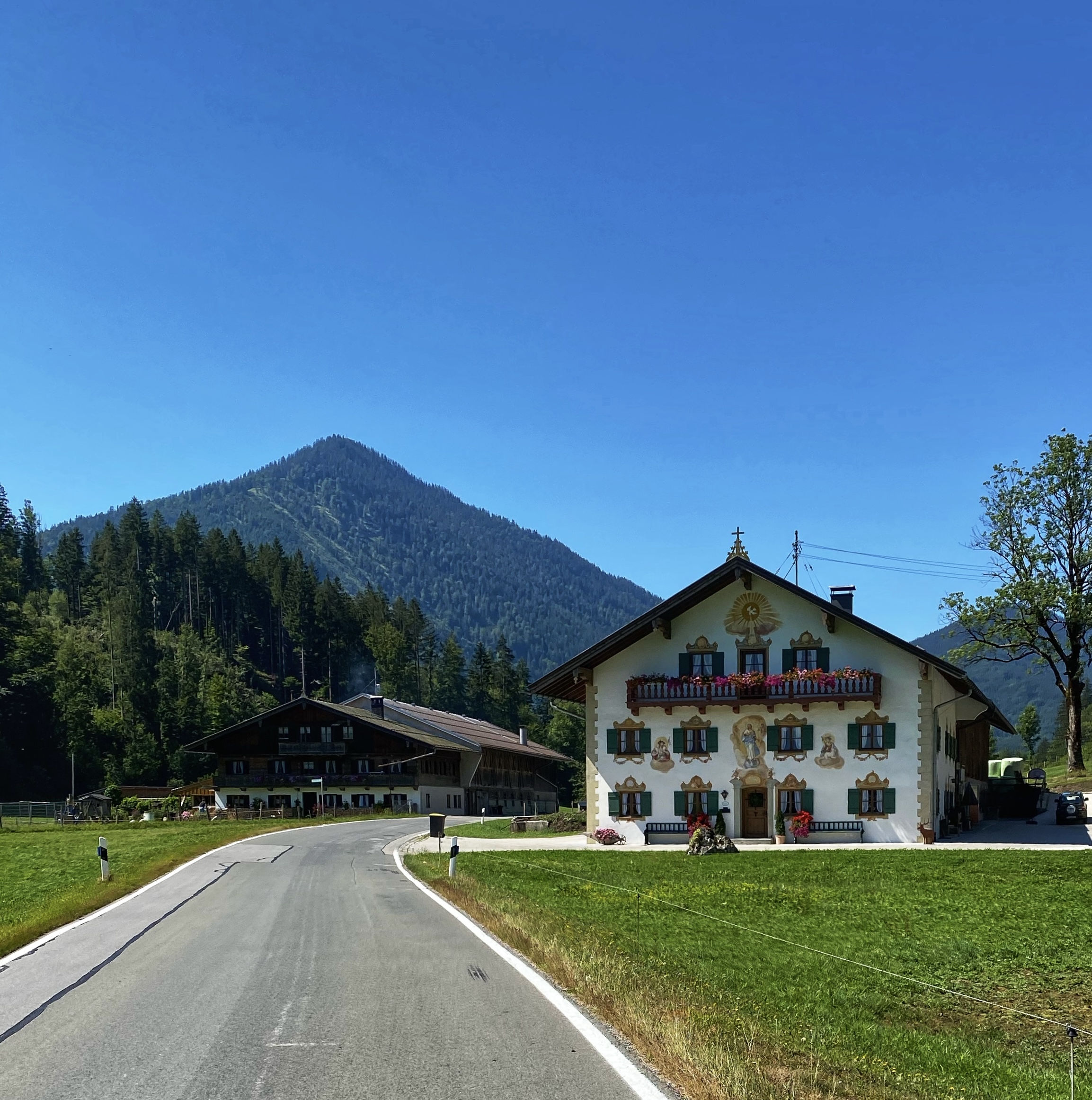 Omdat het vlak is, en ik het gevoel heb wat tijd te zijn verloren, sta ik extra vroeg op. Rijden in het donker over vlakke wegen schiet op, plus de temperatuur is nog aangenaam. In het donker door de stad rijden heeft ook altijd wel wat. Ik heb de route om München heen gelegd en geprobeerd een zo’n gelijkmatig mogelijke klim de Alpen in te krijgen. Soort van de hele dag vals plat. Het loopt lekker, ik heb goede zin en zing liedjes op de fiets. In Höhnenkirchen-Siegertsbrunn, een typisch Beiers plaatsje, ontbijt ik met brood, taart en alles waar ik zin in heb. De bakkersvrouw kijkt me vreemd aan als ik nog eens bij bestel voor onderweg.