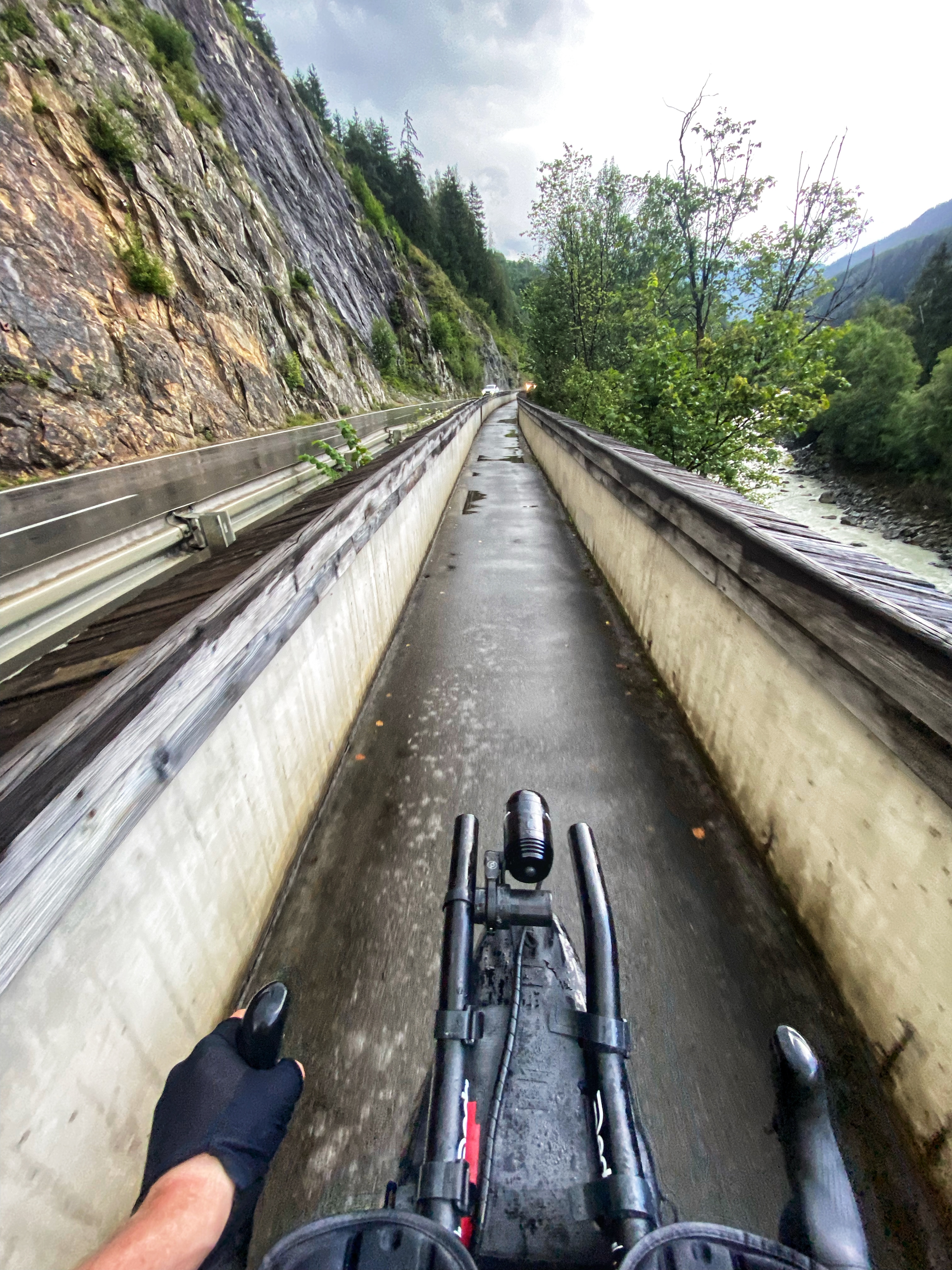 In Landeck begint het te regenen, maar ik draai af naar het zuiden, en goed kijkend naar het dal en de wolken gok ik erop dat doorrijden me droog gaat houden. Klimmend naar de Italiaanse grens zie ik dat ik gelijk heb. Ik krijg wat spetters, maar hou de grote regen achter me. Ik kom Amrei (cap 14) tegen en zij blijkt de zelfde gedachte te hebben. Ik klim sneller, dus laat haar na een korte babbel achter me. Vanaf Pfunds word het steiler, maar ik zit er lekker in, dus fiets lekker door. Wel word het langzaam donker, en ik besluit voor de Umbrail pass een hotel te zoeken. In het donker klimmen durf ik wel aan, maar de afdaling naar Bormio wil ik met daglicht doen.