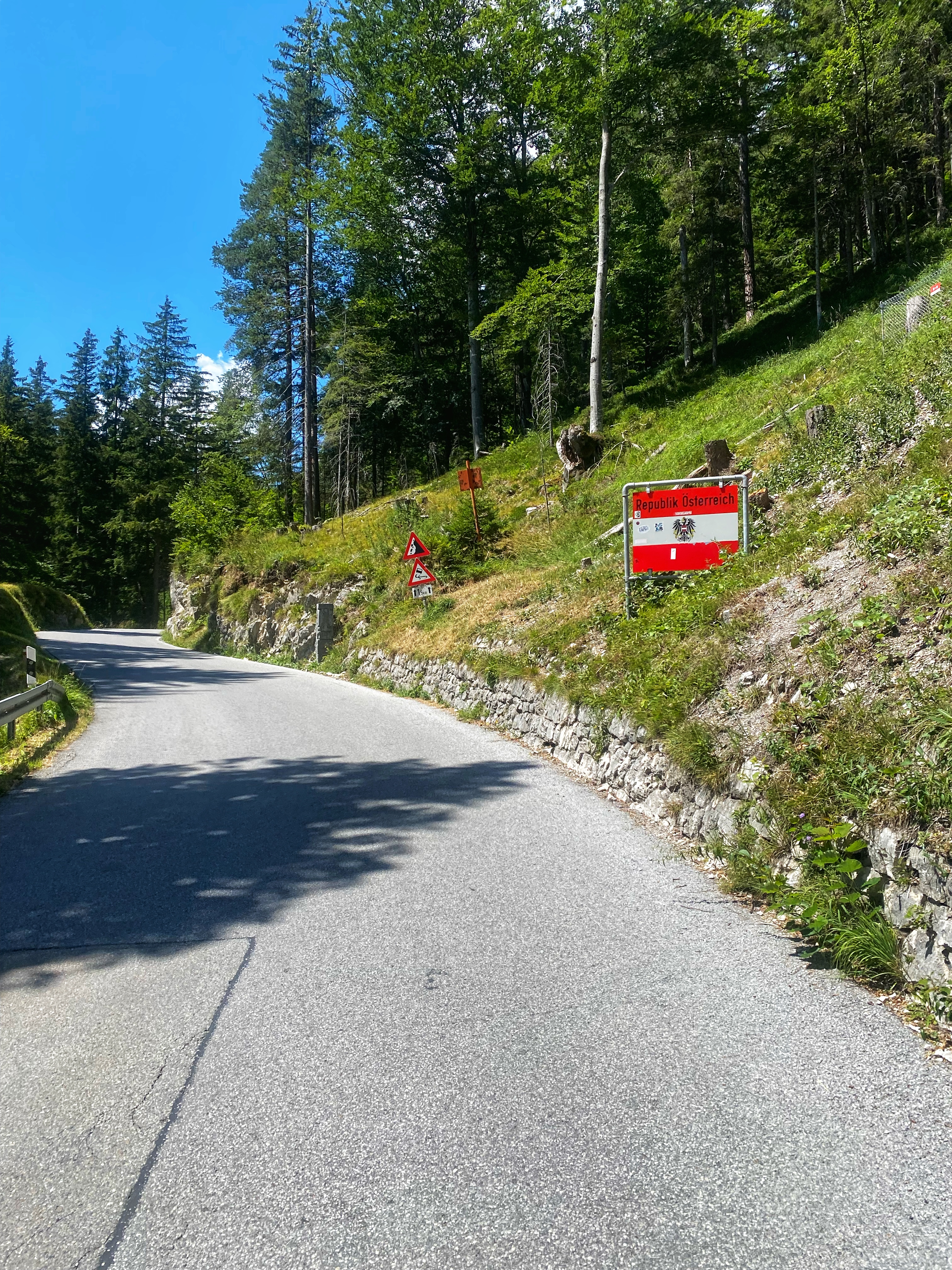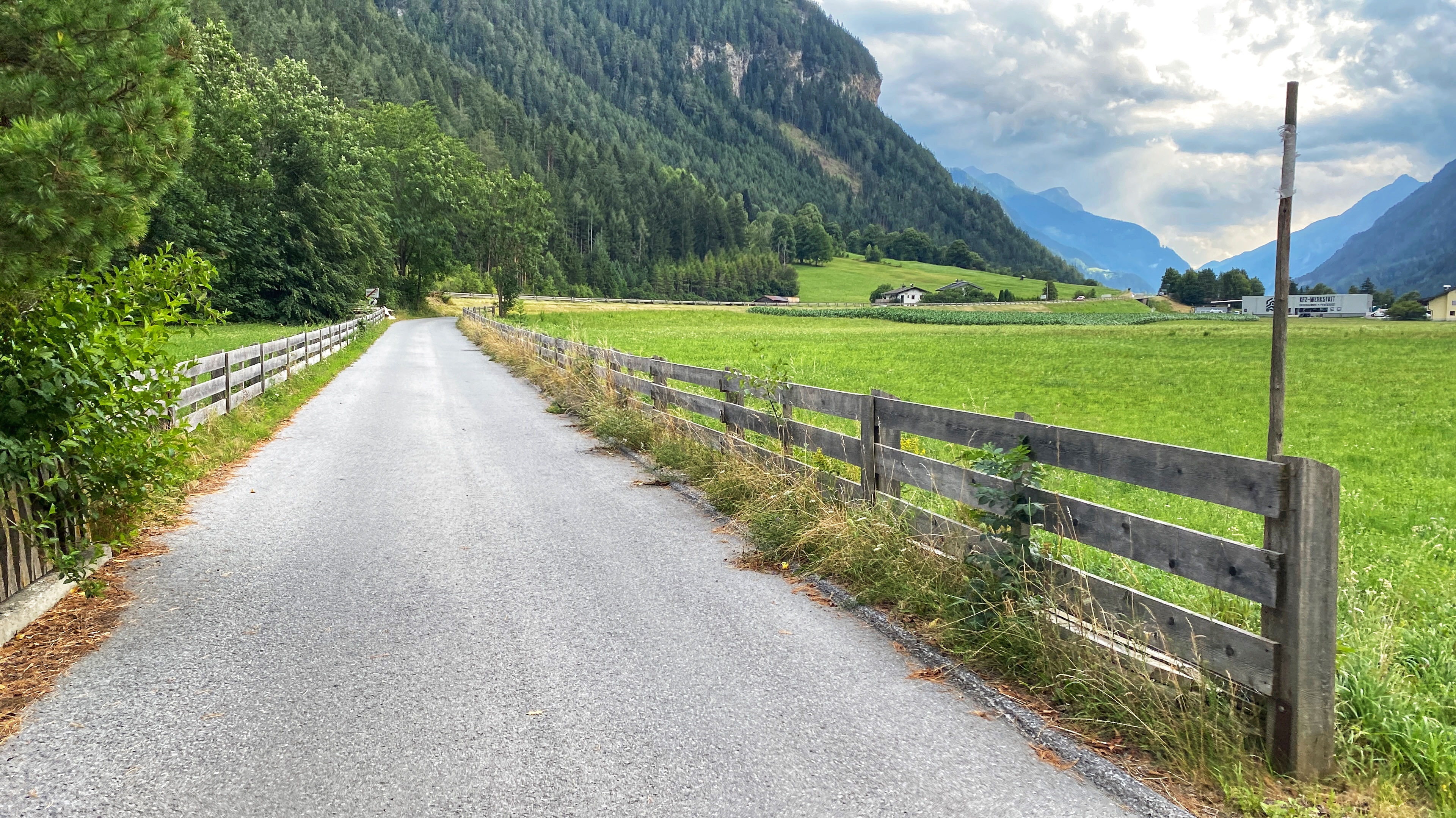 Na de bakkerij rijd ik een stuk door het bos en wanneer ik daar uit kom zie ik de Alpen liggen. Ik kom op een prachtig stuk langs de Jachen en Walchensee en rijd zo via Mittenwald Oostenrijk in. De hele dag gaat het lichtjes omhoog, maar voor het stuk naar de Oostenrijkse grens moet ik toch even een serieuze inspanning doen, om daarna weer op een heerlijk lopende klim terecht te komen. Goed uitgedacht stuk route.