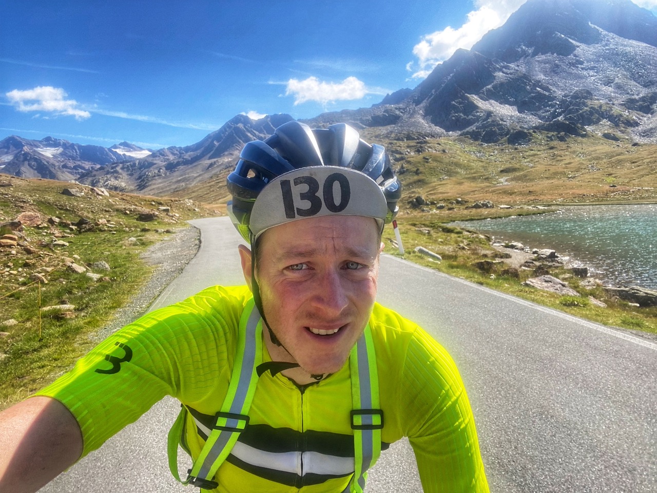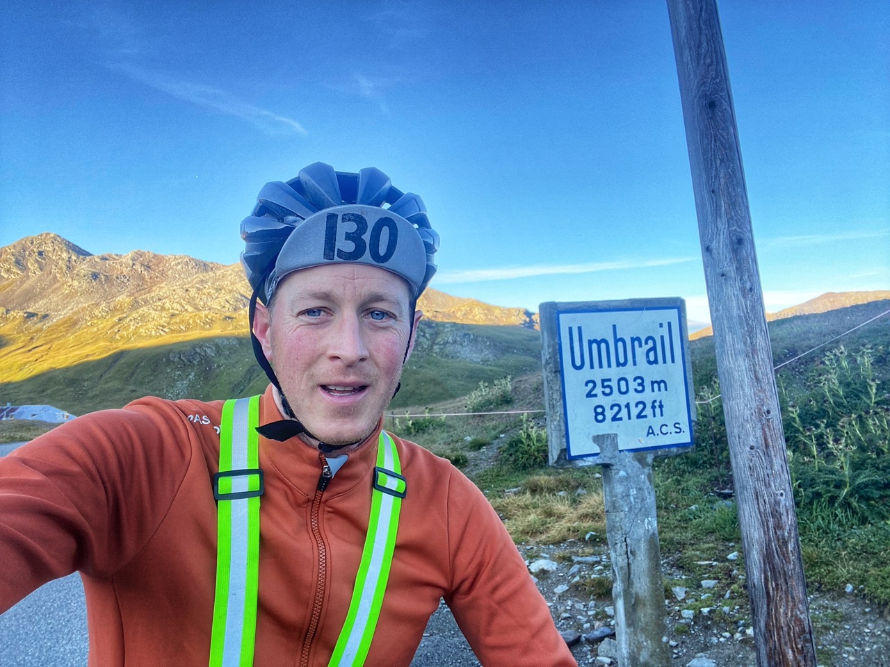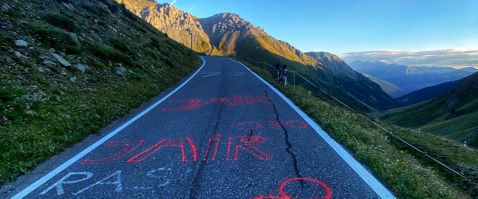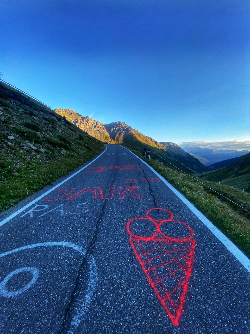 Dit zorgt ervoor dat ik een prachtige zonsopgang heb op de Umbrail pass. Het is leeg, iedereen slaapt nog en het ziet er fantastisch uit. Wel is het zwaar om dit met een niet al te optimaal ontbijt te doen. Gelukkig staat er twee kilometer voor de top een ijsje voor me klaar. Hetty en Niek hebben hier namelijk een wegschildering gemaakt met mijn naam erop en ijsjes. Fantastisch!!! Eenmaal boven pak ik me in, want anders word ik zelf een ijsje; het is fris boven de 2000 meter