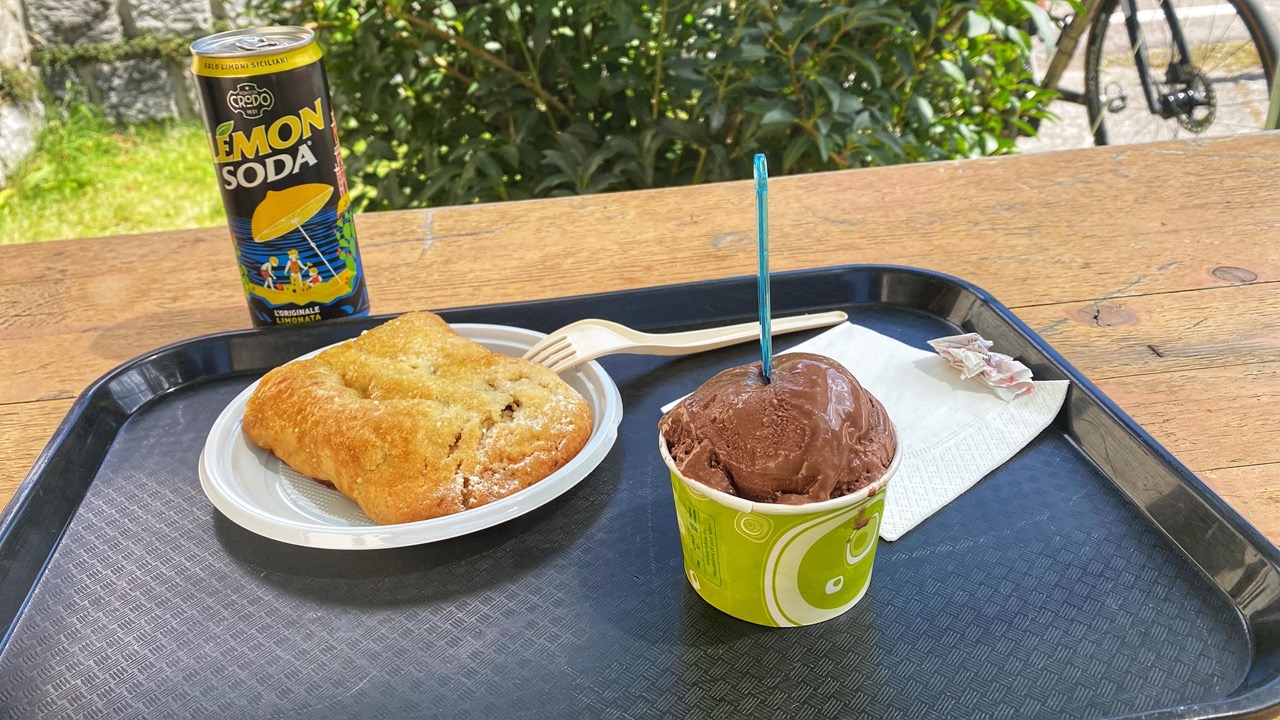 Beneden vind ik een ijskraam / delicatessenzaak, wat een ideale lunchplek is. IJs, zelfgemaakte Apfelstrudel, fruit en broodjes voor onderweg; dat is precies wat ik nodig heb. Perfect om mee door te gaan naar de Povlakte. Ik kom in de vallei in de buurt van Trento en zie ten westen van me wolken opkomen. Mooi, want ik ga de andere kant op. In Trento ga ik inderdaad naar het oosten en heb ik nog een smerig steil klimmetje voor de boeg. 20 plus procent en ik ga hier helaas lelijk op mijn bek. De ketting vloog er namelijk af en wanneer je in het luchtledige trapt is het snel klaar bergop. Het is zonder erg, maar dit betekent wel dat ik een stuk moet lopen. Met ruime dubbele cijfers weer op gang komen lukt me niet.