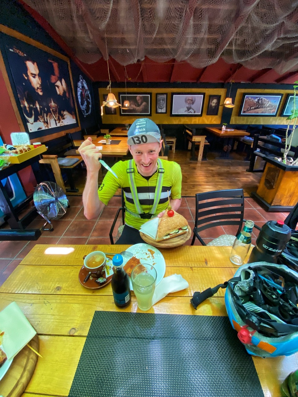 Hier zitten Dennis, Max en Aiden te eten en ik besluit aan te schuiven voor een goede maaltijd. Deze zal nodig zijn, want het verplichte parcours is zwaar en heeft geen voorzieningen. Van de vier op het checkpoint was ik als laatste weg, maar Aiden heb ik in de eerste kilometers van het parcours al te pakken.