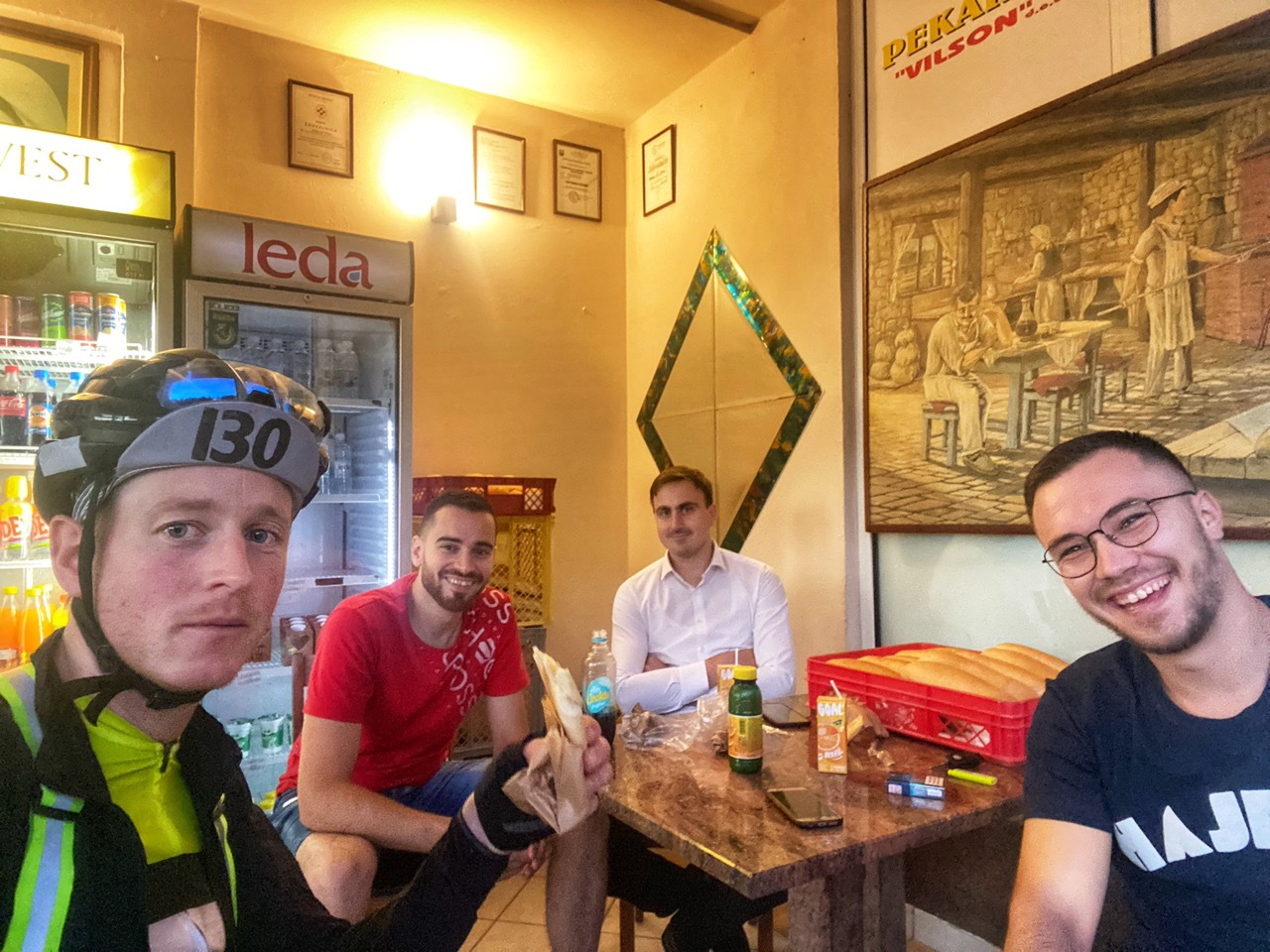 Dan zie ik in Široki Brijeg een bakkerij die al open is. Er zitten drie jongens te eten en ik ga er ook naar binnen. Ze helpen me de bakkersvrouw uitleggen dat ik geen vlees op mijn broodje wil en wenken me bij hen te gaan zitten. Er volgt een moeilijk gesprek in de zin van taalbarrière, waarin ik moet uitleggen wat ik aan het doen ben. Het is gezellig met ze en op het moment dat ik wil afrekenen mag dat absoluut niet. “If you come all the way to Bosnia by bike, we’ll show you Bosnian hospitality”. Ik wil ze niet gaan uitleggen dat ik dit eigenlijk niet mag aannemen binnen de regels van de race dus besluit er vrede mee te hebben. Ze zijn er immers ook helemaal niet op uit om me op die manier te helpen. Ik wilde eigenlijk nog bijbestellen voor onderweg maar dat durf ik nu niet aan. Dat doe ik dan wel in Mostar. Deze ontmoeting geeft me meteen goede zin en fluitend kom ik aan in Mostar waar ik brood bij koop alvorens ik de bergen in ga.