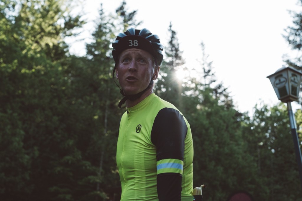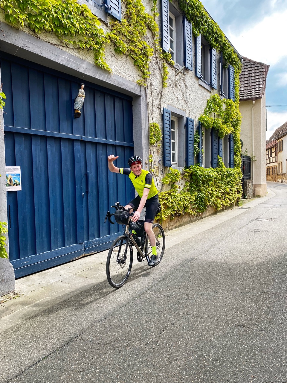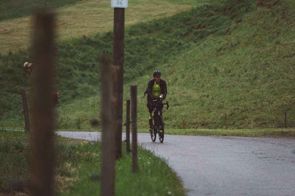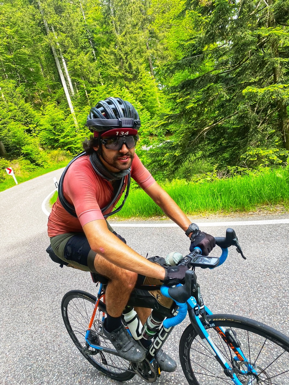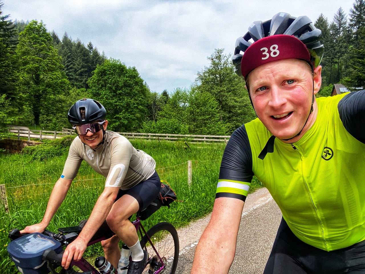 Op een van de eerste bergen in het Zwarte Woud raap ik zo Zeno op, die ik ken van de Transcontinental Race. We maken een korte babbel. Niet veel later kom ik Anatole tegen die ik weer ken van the Unknown Race. Hij rijdt op een huurfiets en heeft old skool twee bandjes om zijn nek hangen. Het ziet er fraai uit, maar dat is het niet. Snel zal hij ook moeten opgeven wegens materiaalpech.