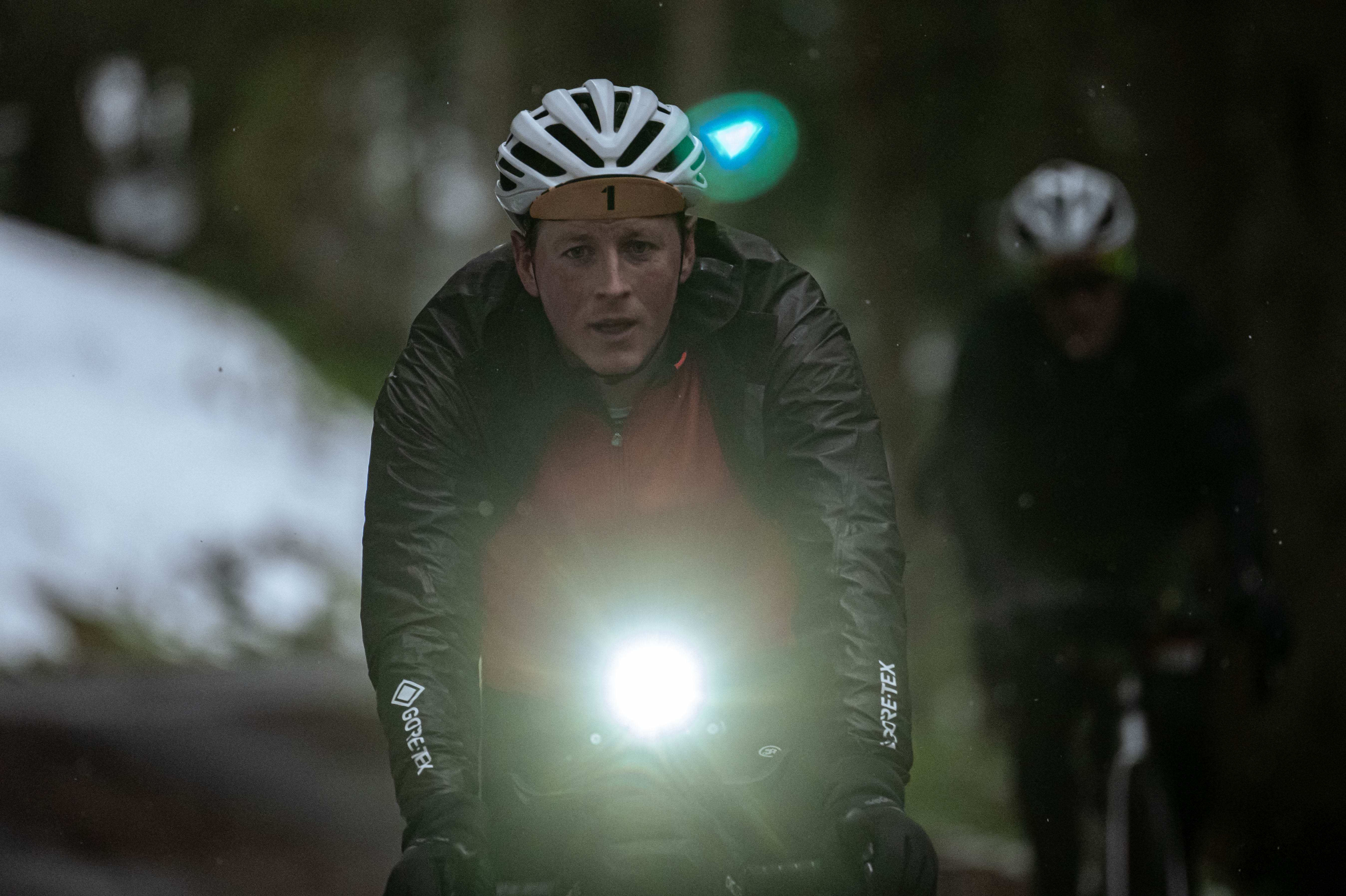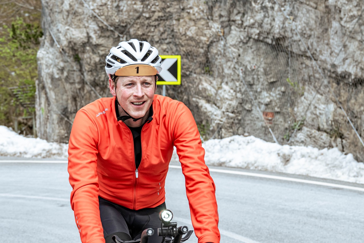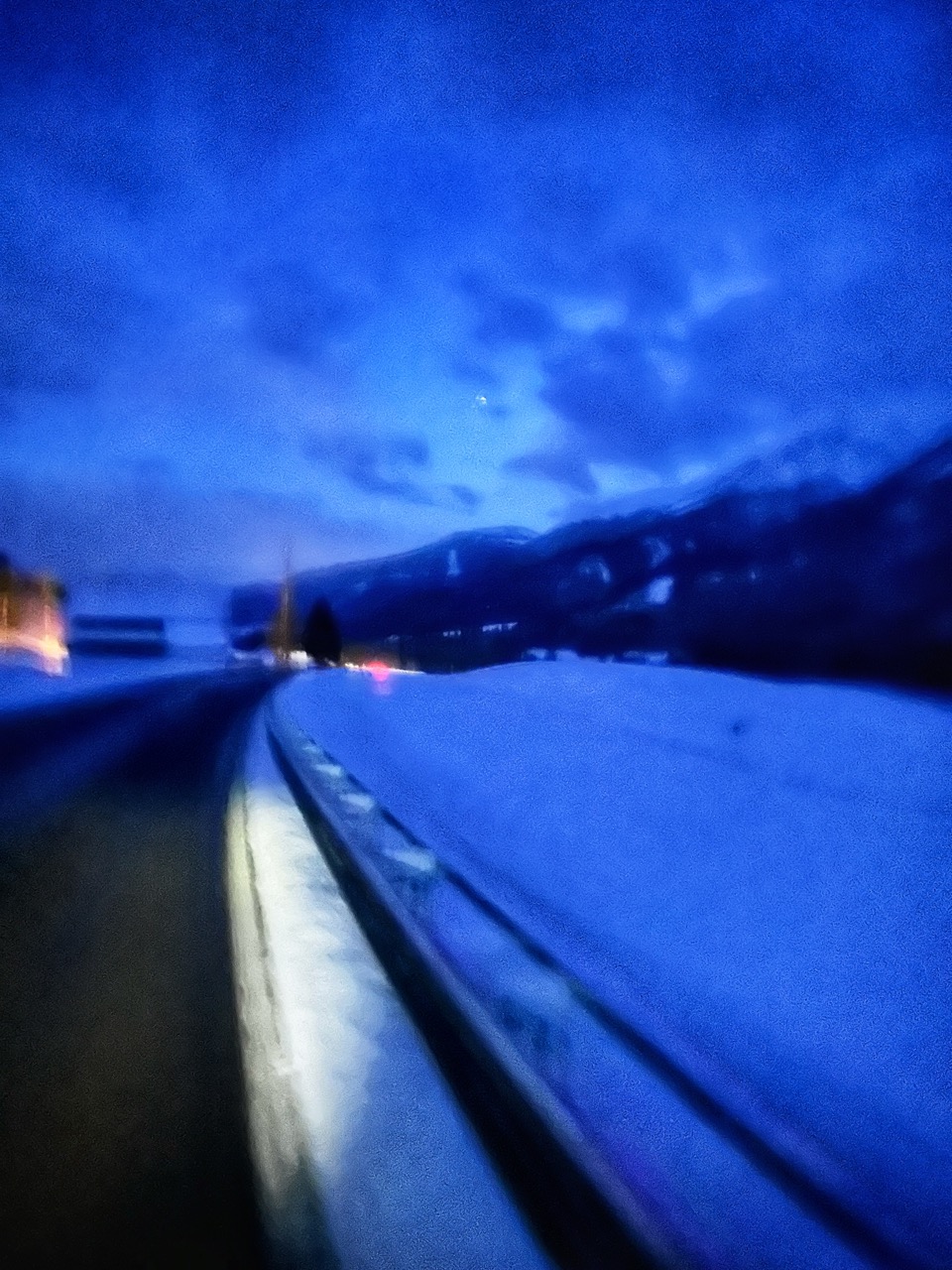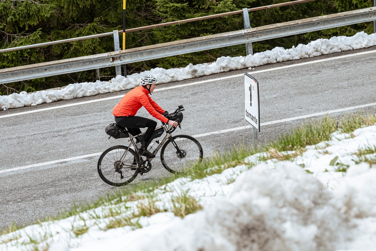 In de verte zie ik een lichtje dat op en neer gaat. “Een raar moment voor wegwerkzaamheden”, denk ik. Op een wat stiller stuk slipt mijn achterwiel weg. De eerste keer negeer ik het, maar na twee a drie keer merk ik dat de weg op plekken bevroren is. In het donker zie ik niet waar wel en waar niet, dus besluit ik te lopen. Na 300 meter merk ik dat de weg compleet bevroren is en weet ik dat ik alleen lopend verder kan. Met mijn wielrenschoenen heb ik maar weinig grip en ik moet de fiets gebruiken om stabiel te blijven. Langzaam maar zeker kom ik dichterbij het licht dat nog steeds op en neer gaat. Wanneer ik de bocht om ben zie ik dat dit een vrachtwagen is die niet verder komt vanwege het ijs. Beangstigend. “Hoe dom van me om alleen naar de sneeuwval te kijken en er niet over na te denken dat het wegdek glad kan zijn?” Ik ben nagenoeg bij de top dus mijn opties zijn terug of lopend verder. Ik kies voor het laatste en ben drie uur bezig met de volgende 4 kilometer. Op sommige stukken slechts voetje voor voetje. Net na de top wordt er gestrooid, maar ik durf het pas een stuk verder aan om fietsend verder te gaan.