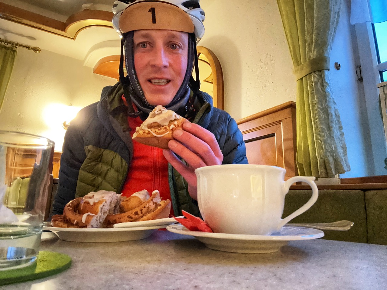 Waar ik lopend goed warm bleef, koel ik in de afdaling heel hard af. De combinatie van ijzige kou die versterkt wordt door rijwind met het dalen van je hartslag doordat er geen fysieke inspanning meer is doet me rillen op de fiets. Min 8, geeft mijn wahoo aan. In een dorpje in het dal vind ik een bakker die net open is en besluit hier op te warmen. Over de pakweg 15 kilometer die ik heb afgelegd heb ik 4 uur gedaan.