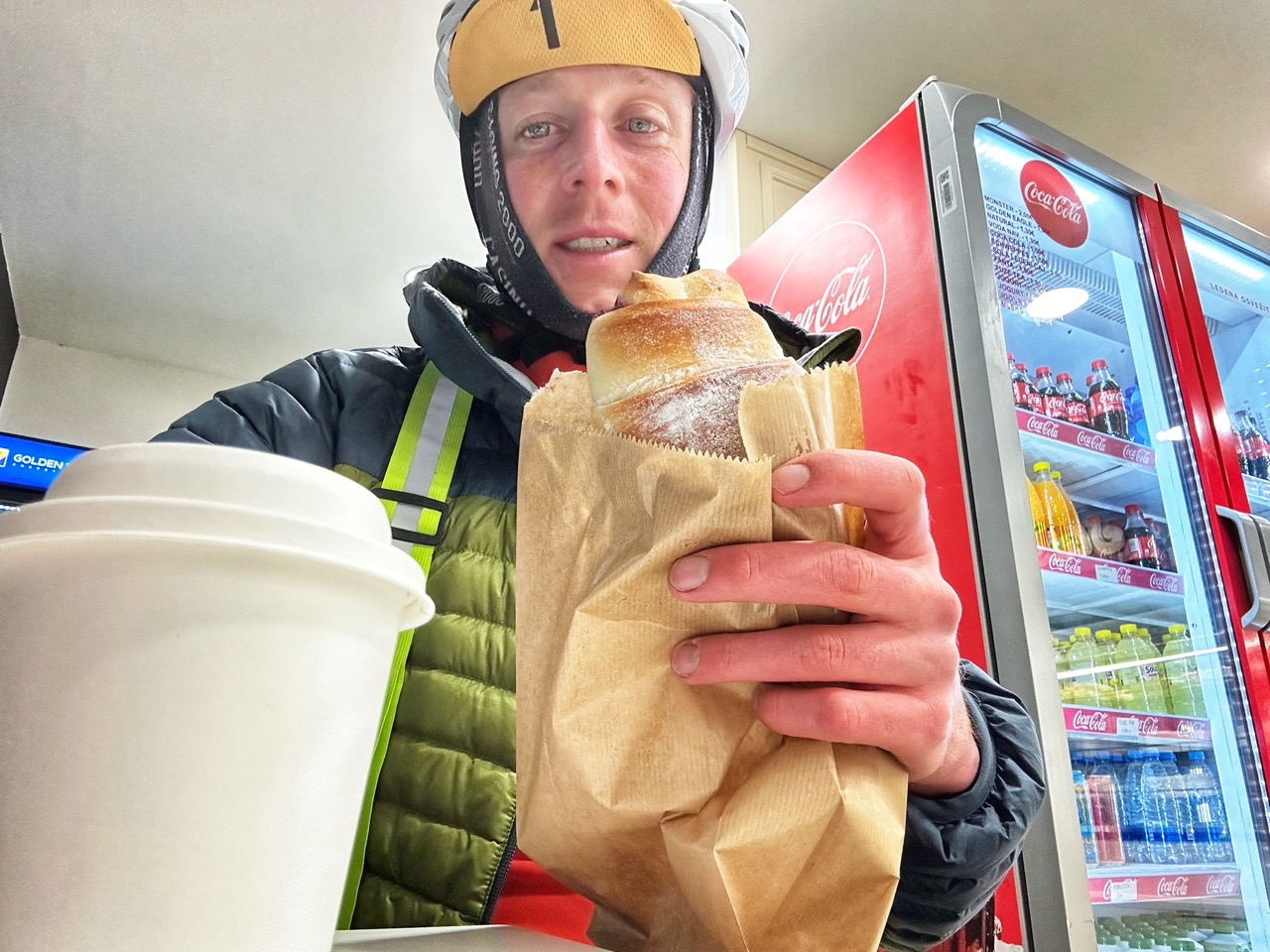 Net voor de zon weer opkomt krijg ik het zwaar. Ik snak naar koffie en probeer een powernap te doen in een bushokje. Het tocht hier zo erg dat ik na 5 min stilzitten toch maar weer op de fiets klim. Gelukkig kom ik niet heel veel later een bakkerij tegen waar ik weer kan opwarmen met koffie en een broodje. Dit zet me weer genoeg op scherp om verder rijden en de mindset weer op efficiëntie te leggen.