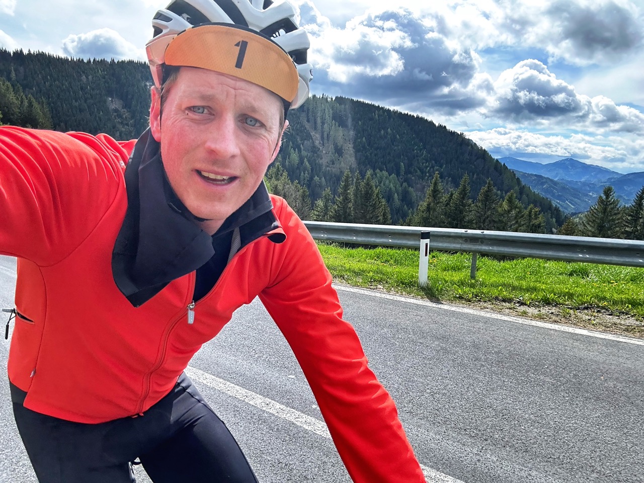 Terwijl mijn tassen vol met reepjes zitten en ik op de fiets langzaam nog een verse kaneelbol weg aan het stouwen ben, word ik bijgehaald door Rene. We rijden een stukje samen op, want nadat mijn handen en mond leeg zijn hebben we weer ongeveer hetzelfde tempo. In Graz kunnen we zo van stoplicht naar stoplicht wat verhalen uitwisselen. Leuk, totdat hij net wel het oranje licht pakt en ik besluit te wachten. Na Graz haal ik hem bij een tankstation weer in, om hem vervolgens op de klim naar CP3 weer tegen te komen. Hij rijdt nét wat sneller omhoog maar blijft de hele tijd in beeld. Vlak voor de top hoor ik opeens een ratel. Een dotwatcher gewapend met een toeter en ratel moedigt eerst Rene daarna mij aan. Erg leuk.