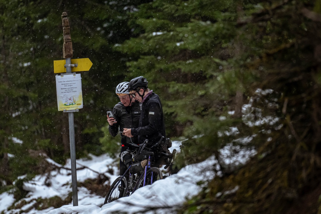 Bij Waidhofen ga ik de bergen in. Waar ik in het dal mazzel had met slechts een klein buitje her en der begint het in de bergen te sneeuwen. Niet heel erg veel, maar ik merk vooral dat de temperatuur hard zakt. Rond dit moment hoor ik ook dat het coördinaat van CP1 is aangepast vanwege de sneeuwval, wat bekent dat we niet helemaal naar de top hoeven maar tot ergens net eronder. Naarmate ik verder uit het dal wegrijd wordt het kouder en kouder. Gelukkig heb ik mijn winterjas met extra voering mee en ik besluit me om te kleden om warm te blijven. Wanneer ik omhoog rijd gaat de rits vol open om niet te hard te zweten en mijn ondershirts droog te houden, wanneer ik afdaal gaat alles dicht. Deze tactiek werkt en ik weet redelijk warm te blijven.