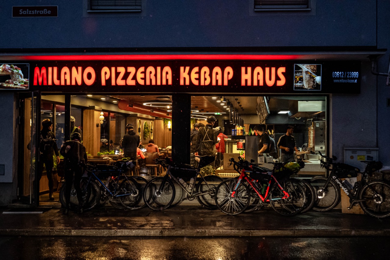 In het dorp is een kebab tent waar veel renners zitten. Omdat het koud begint te worden besluit ik hier de route te maken naar CP2. Nog geen 5 minuten binnen begint het hard – heel hard – te sneeuwen en komen er berichten dat er passen dicht zijn. Ik wilde eigenlijk alleen een route maken en snel doorrijden, maar gezien deze berichten lijkt het me een goed idee de route wat langer te overdenken en dus ook maar wat te eten te bestellen. Er druppelen langzaam maar zeker meer fietsers binnen die er steeds natter en viezer uitzien. Er is een sneeuwstorm op de heuvel waar ik nog geen uur geleden was en realiseer me dat ik mazzel heb gehad. Het maken van de route wordt nu wel gecompliceerd. Ergens moet ik naar het volgende dal, maar een pas overgaan in deze condities is gewoonweg te gevaarlijk. Een vijftiental renners is wel door en ik ben in dubio. Mijn hart zegt doorrijden en racen maar het verstand spreekt dit tegen. Uiteindelijk wint het verstand en durf ik er niet achteraan te rijden.