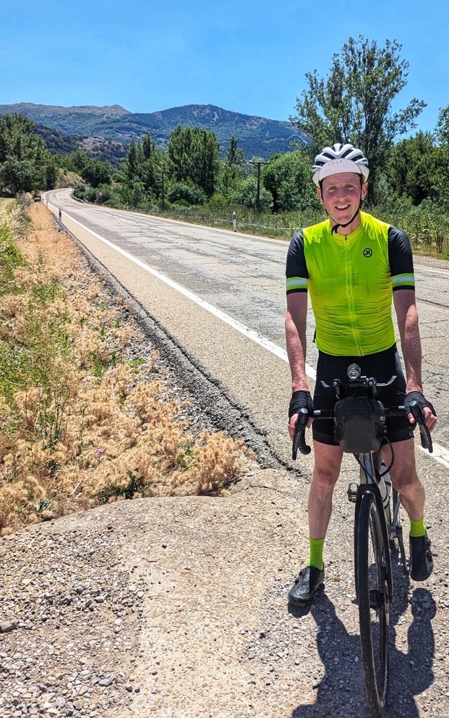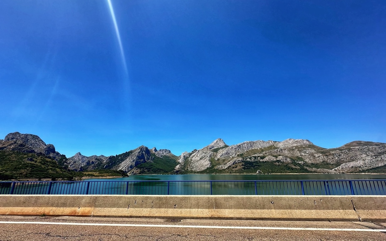 Gate 1 en 2 horen bij elkaar en zijn de picos. Het begint met een kort steil klimmetje naar het stuwmeer, en daar is gate 1. Vervolgens gaat de route glooiend langs het stuwmeer naar Boca de Huérgano om daar in een vallei te komen die naar een pas loopt van 10 km. Overal is het groen en er stroomt water door de vallei. Op het moment dat ik de pas op ga zie ik Sam in de verte, wat me de kracht geeft wat harder te fietsen. Op de top zien we elkaar kort. Hij maakt een foto, ik ga meteen de afdaling in. Een hele hele lange, mooie, nog steeds groene afdaling.