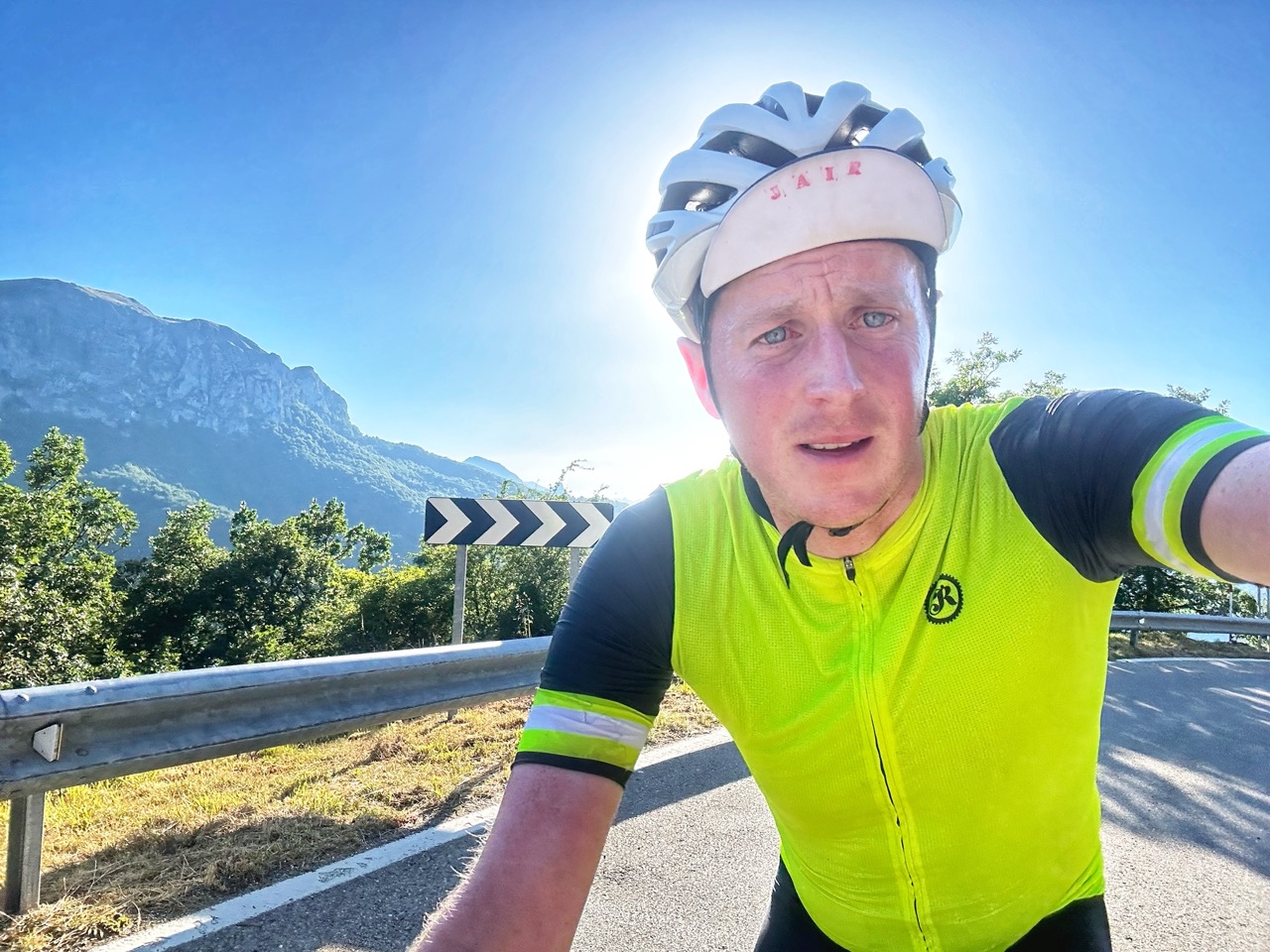 In het dorp in het dal doe ik eerst boodschappen en ga daarna eten. Op het terras zitten andere fietsers die vragen wat ik aan het doen ben en me ondertussen helpen met de bestelling. Rustig zitten eten voelt als tijdsverlies maar ik weet hoe ik vanochtend nog op een bankje voor een supermarkt lag, dus ik dwing mezelf tot rust en het nuttigen van een goede maaltijd.
