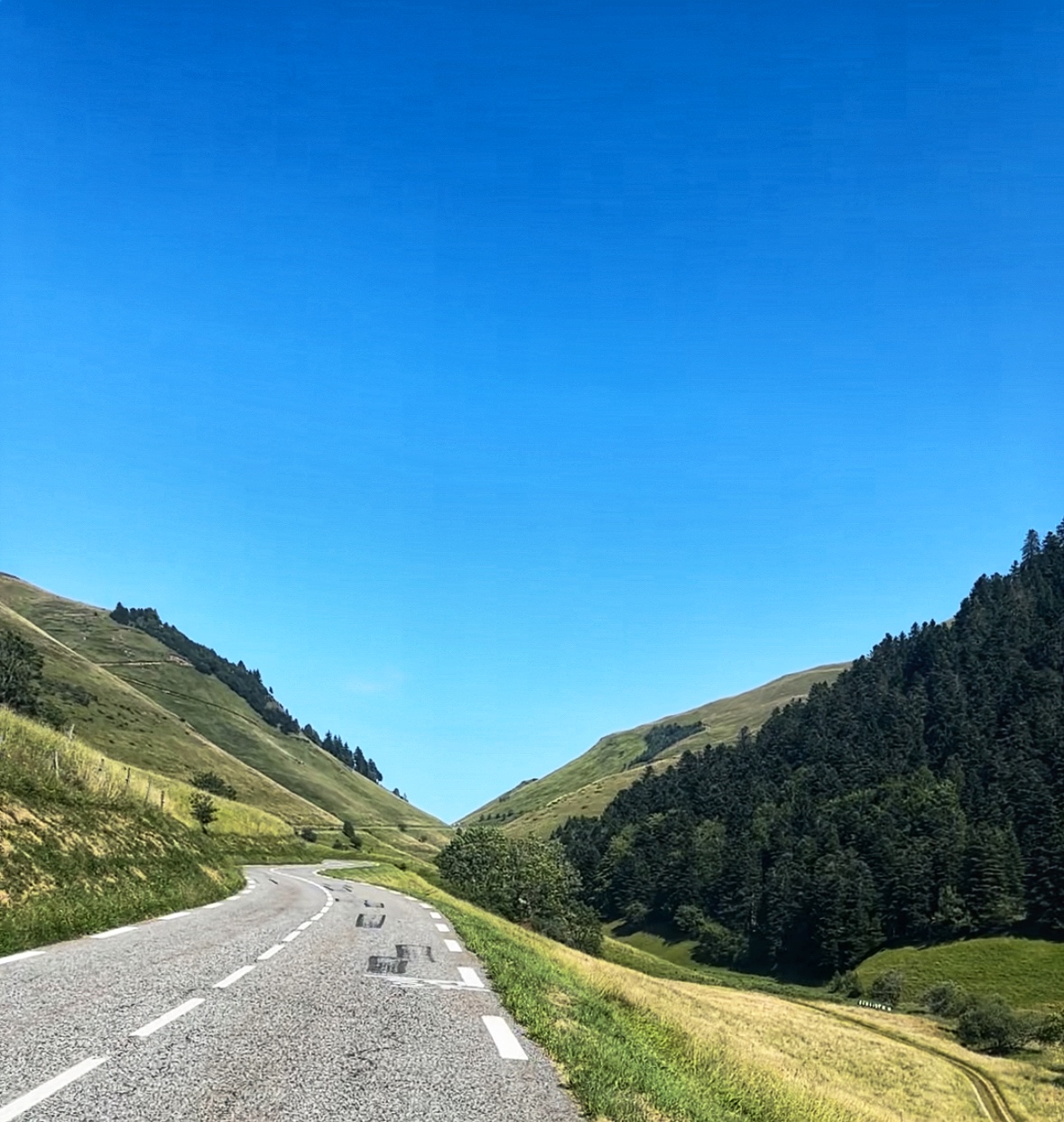 Met vers water in de bidons vertrek ik richting Pyresourde die er warm bij ligt. Er is nauwelijks beschutting op de vrijwel rechte weg naar de top. Niet een heel moeilijke col, maar wel heet. Net voor de top komt Juhani me weer voorbij en ben ik door mijn water. Maar ik weet: gate 4 is in de tas en in het dal kan ik bijvullen.