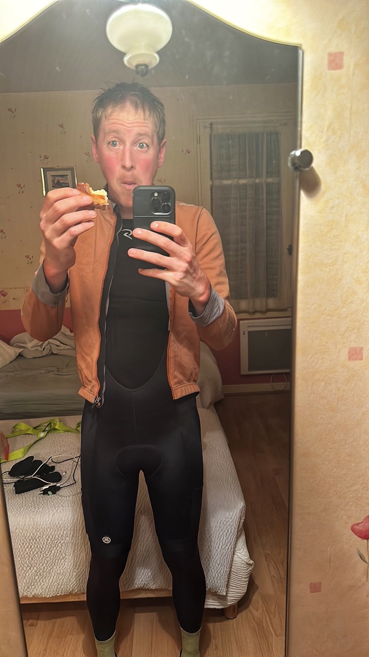Gisteren te vroeg binnen naar mijn smaak, dus zorg ik dat ik vandaag om 4u op de fiets zit. Koud de Puy Marie op en in het donker. Gelukkig heb ik wel met taart kunnen ontbijten. Fabriekstaart uit de supermarkt, maar taart is taart, dus mijn moraal is stukken beter dan afgelopen dagen toen ik de Portalet in het donker moest doen.