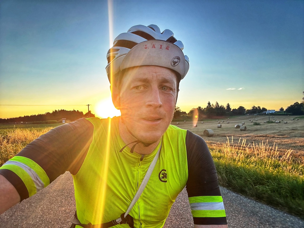 Net voor de top begint het te schemeren en zie ik een fotograaf van de organisatie op een rots staan om foto’s te maken. Niet veel later komt hij achter me aan. Het is een soort fietskoerier met een rekje voor waarop een lamp hangt die hij gebruikt voor de foto’s. Op de top hebben we een kort gesprek en maakt hij foto’s van hoe ik mijn kleren verwissel. Daarna wenst hij me een goede afdaling en scheiden onze wegen.