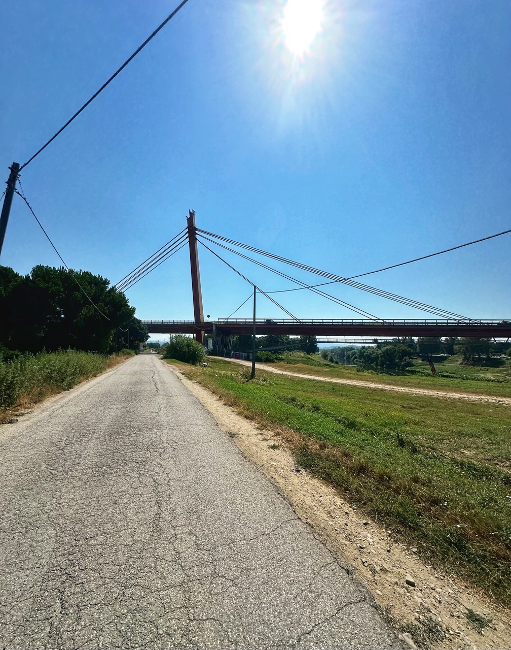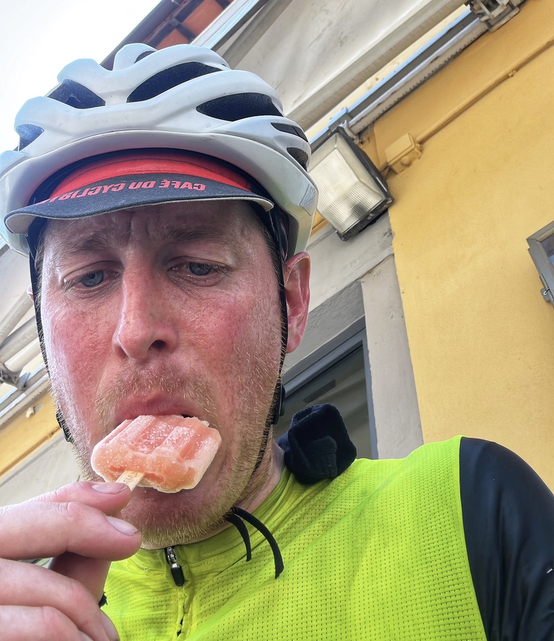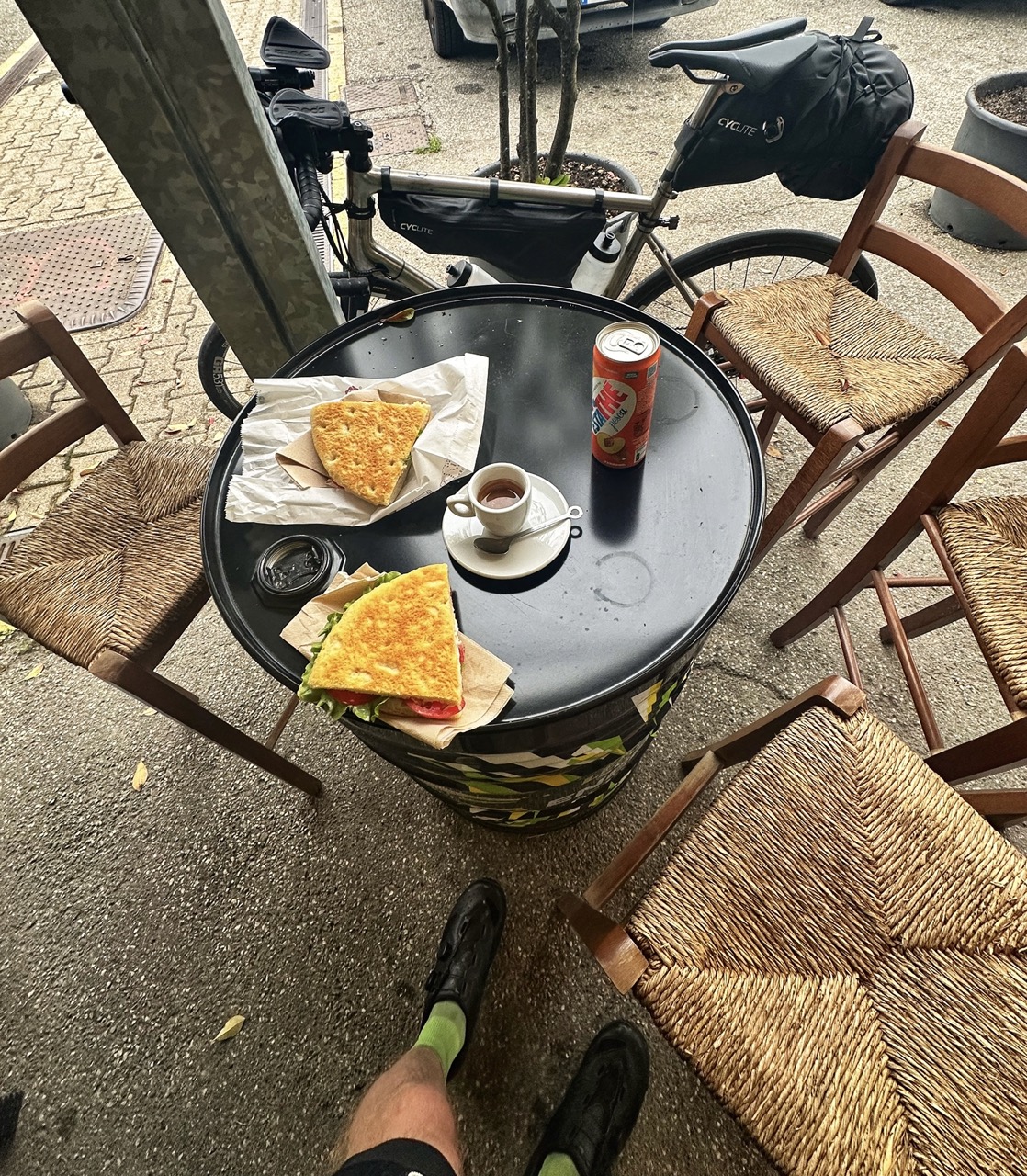 Beneden aangekomen is het al warm geworden. Tot Florence zal ik in het dal blijven en vlakke kilometers voor de boeg hebben. Op dit stuk stop ik twee keer. Een keer bij een fietsenmaker voor een druppel olie en bij een supermarkt voor resuply. Ik kijk hier op de tracker en zie dat Eivind en Juhani nog ver achter me zitten. Dat is alvast mooi. Dit vasthouden. Vooral van Eivind ben ik nog niet af.