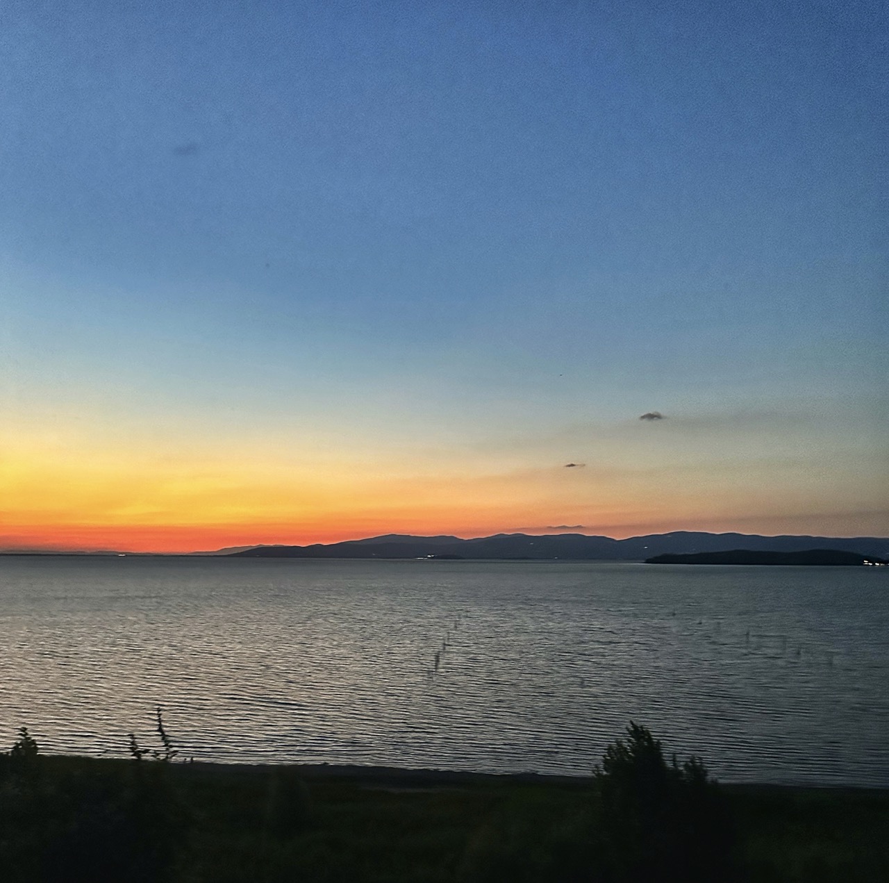 Op de weg naar het meer merk ik dat het wegdek slechter wordt en wanneer er een auto lange tijd achter me zit begin ik me een beetje te ergeren. Het blijken de fotografen van de race die me stiekem hebben beslopen. Ik moet erom lachen en besef me hoe moe en prikkelbaar ik momenteel ben. Deze korte encounter beurt me wat op en de zonsondergang rondom het meer doet de rest.