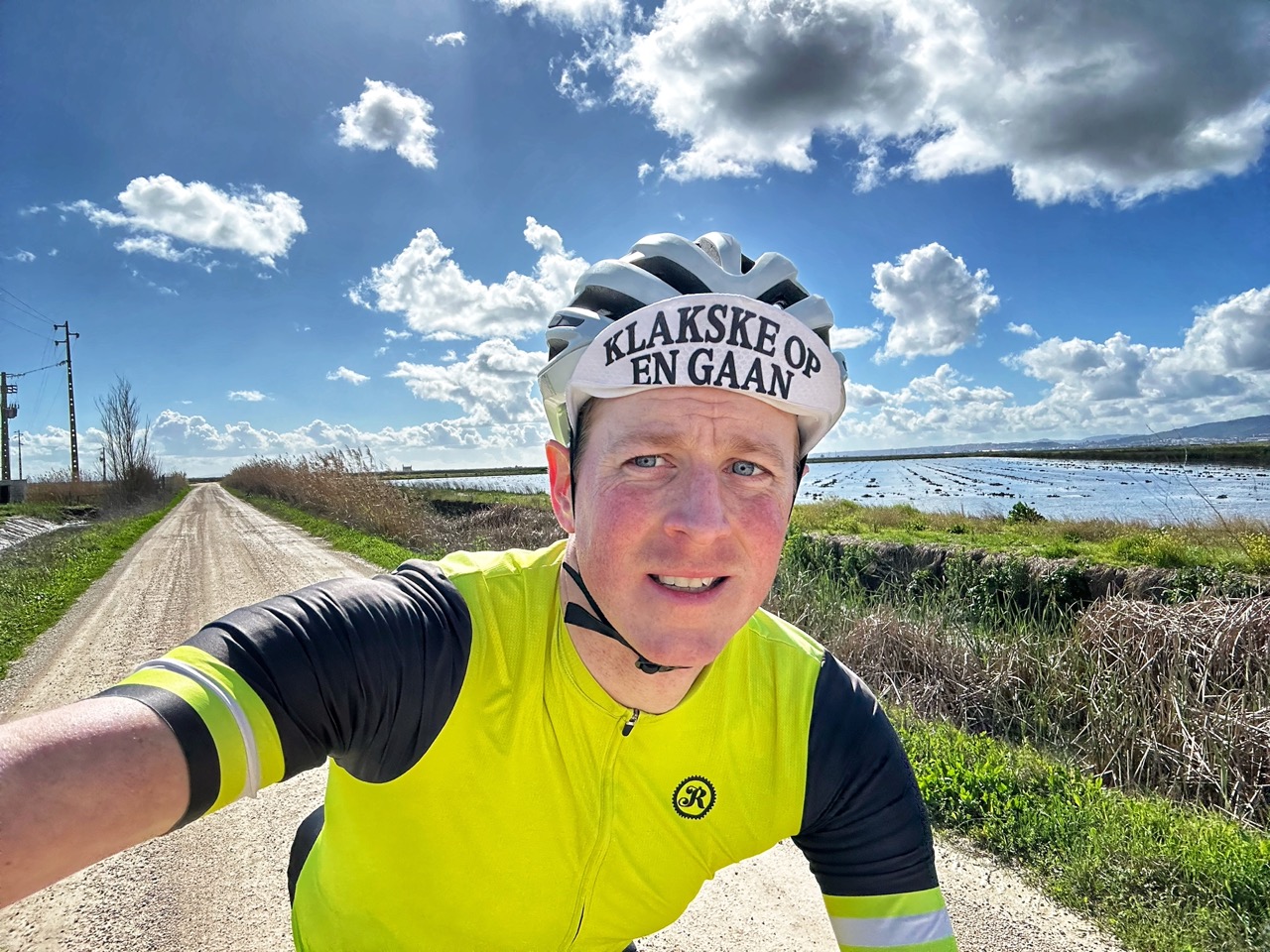 De zon lijkt te hebben gewonnen. Ik zie het water op het asfalt verdampen dus mijn regenjas en buff kunnen uit en omdat ik toch stilsta smeer ik me meteen in. Te vroeg gejuicht. Een half uur later fiets ik een plensbui in. Het duurt nog geen tien minuten, maar het is genoeg voor een nat pak en het wast alles wax van mijn ketting. De temperatuur blijft aangenaam, dus afkoelen doe ik niet.